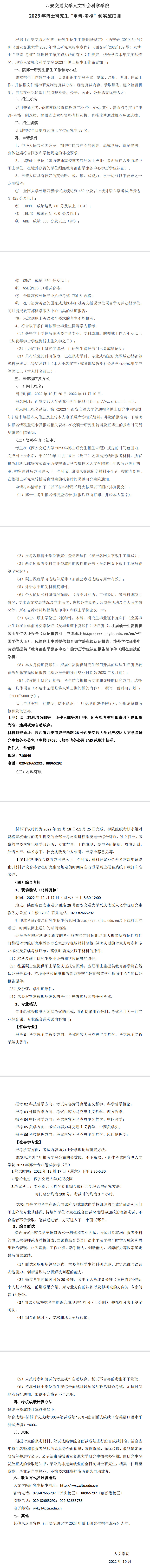 西安交通大学人文学院2023年博士研究生“申请-考核”制实施细则