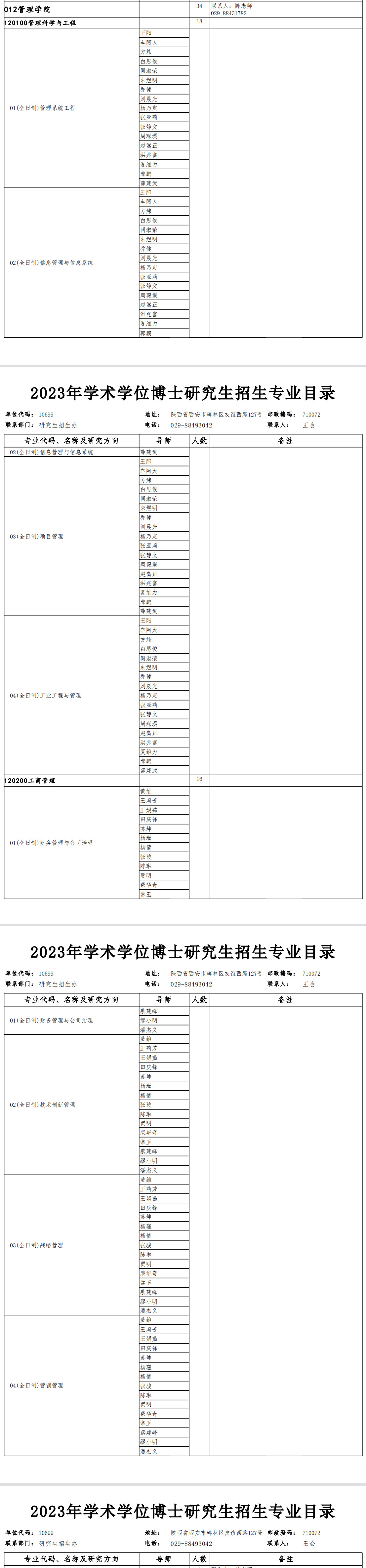 西北工业大学2023年管理学院学术型博士研究生招生专业目录