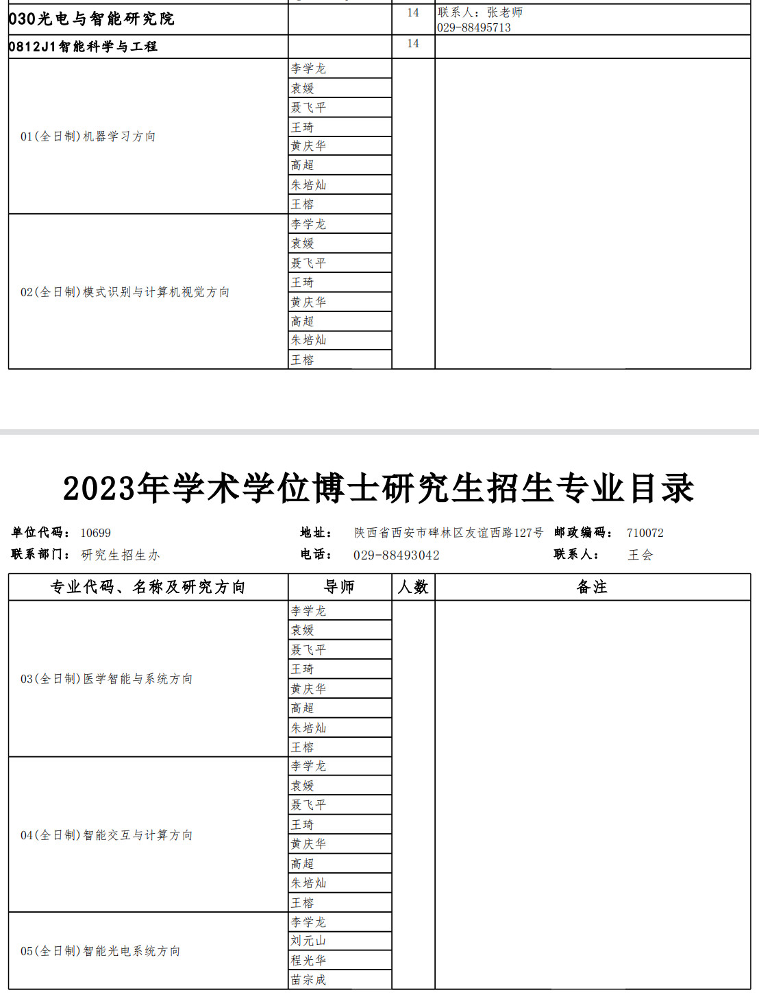 西北工业大学2023年光电与智能研究院学术型博士研究生招生专业目录