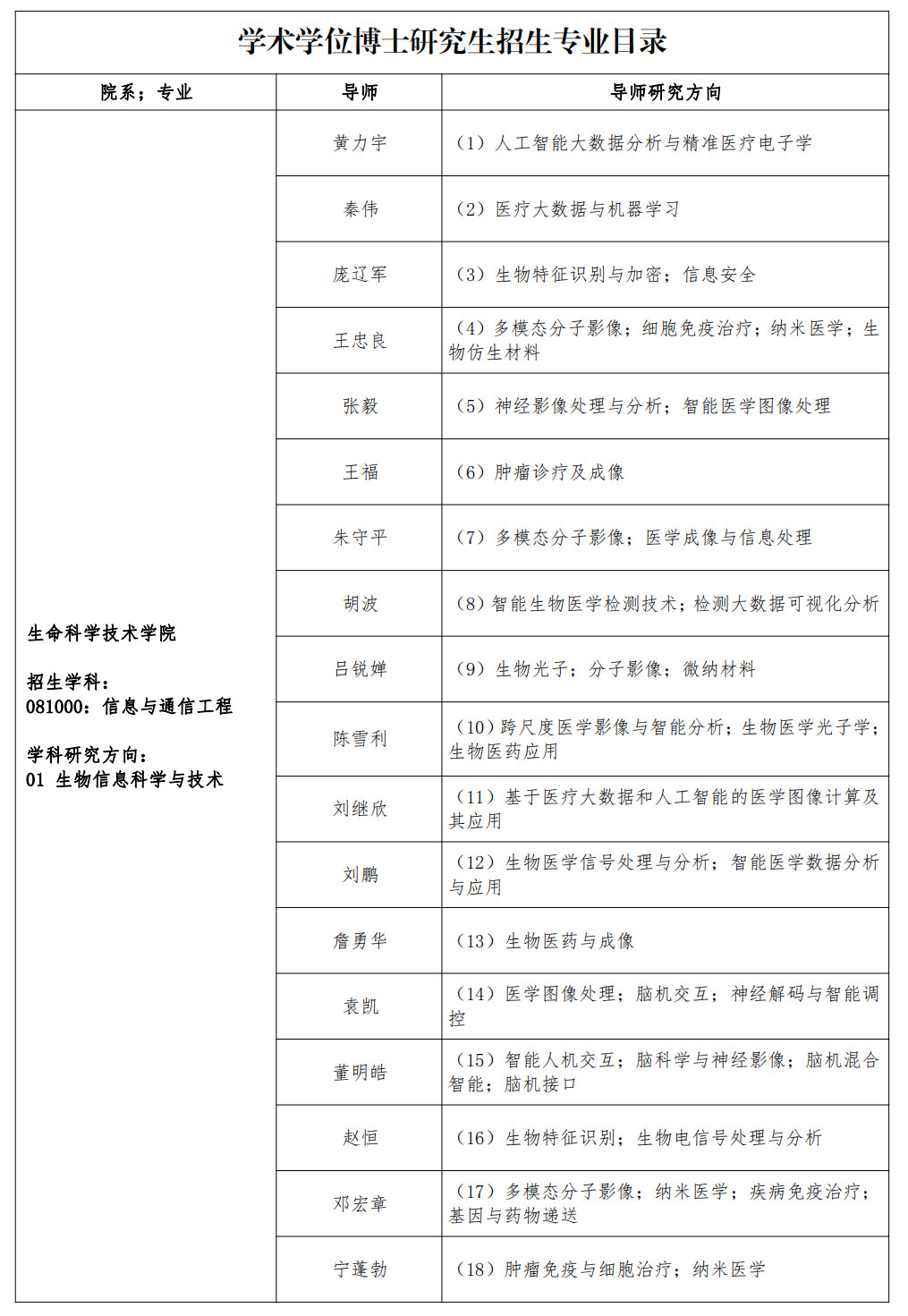 西安电子科技大学2023年生命科学技术学院学术学位博士研究生招生专业目录