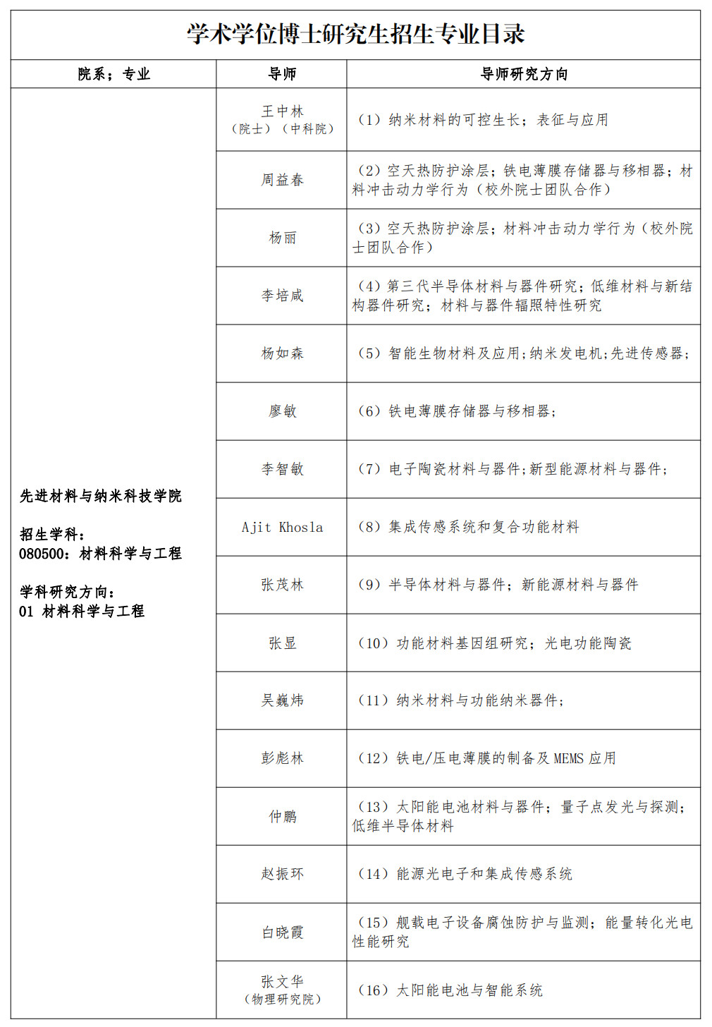 西安电子科技大学2023年先进材料与纳米科技学院学术学位博士研究生招生专业目录