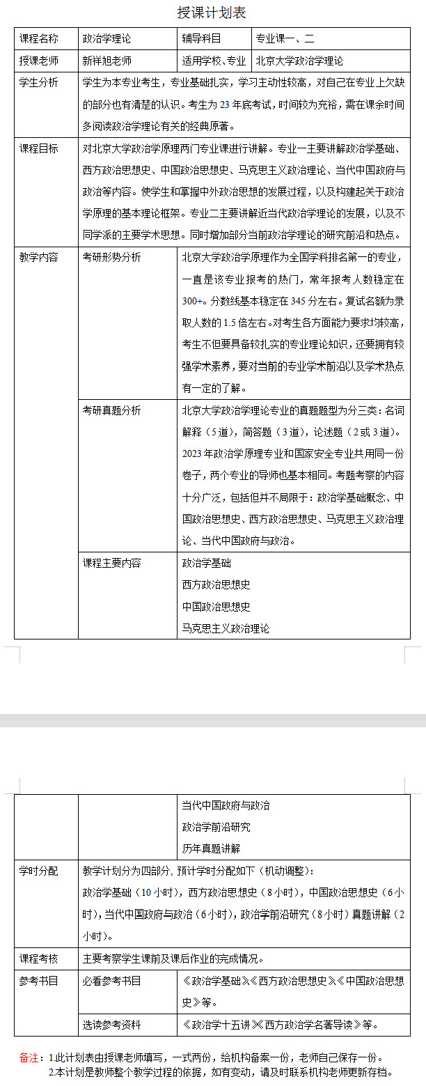 新祥旭考研:2024年北京大学政治学理论专业考研一对一辅导授课计划
