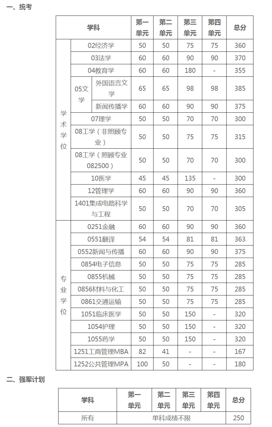 单科成绩不限,总分不低于对应统考门类(专业)学校分数线的98%(四舍五入取整)。