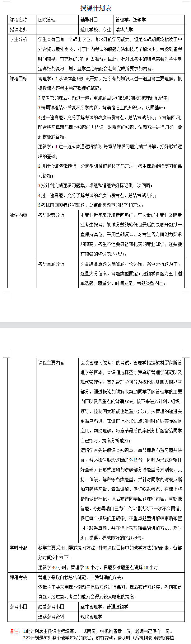 新祥旭考研:2024年清华大学医院管理专业考研一对一辅导授课计划
