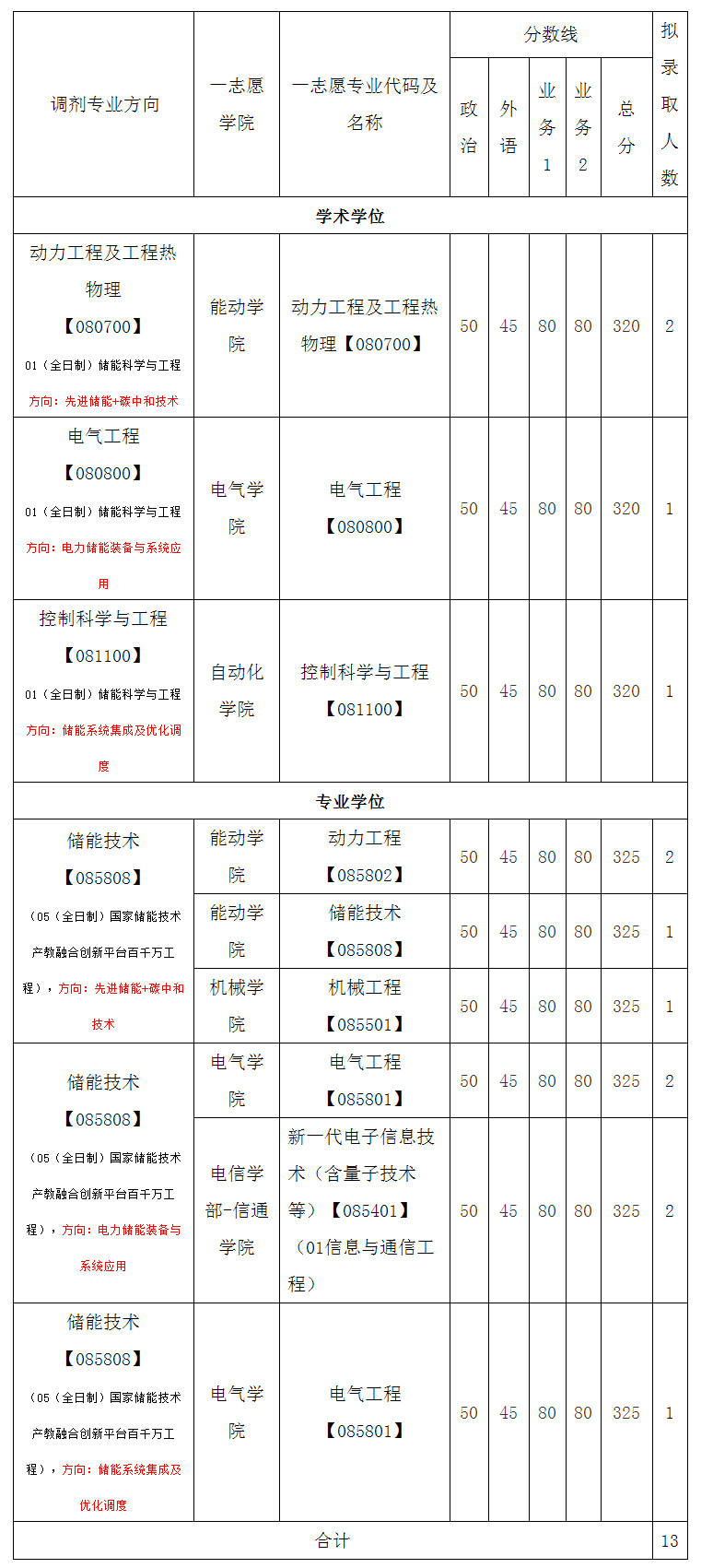 学术学位:080700动力工程及工程热物理【01(全日制)储能科学与工程(先进储能+碳中和技术)】、080800电气工程【01(全日制)储能科学与工程(电力储能装备与系统应用)】、081100控制科学与工程【01(全日制)储能科学与工程(储能系统集成及优化调度)】