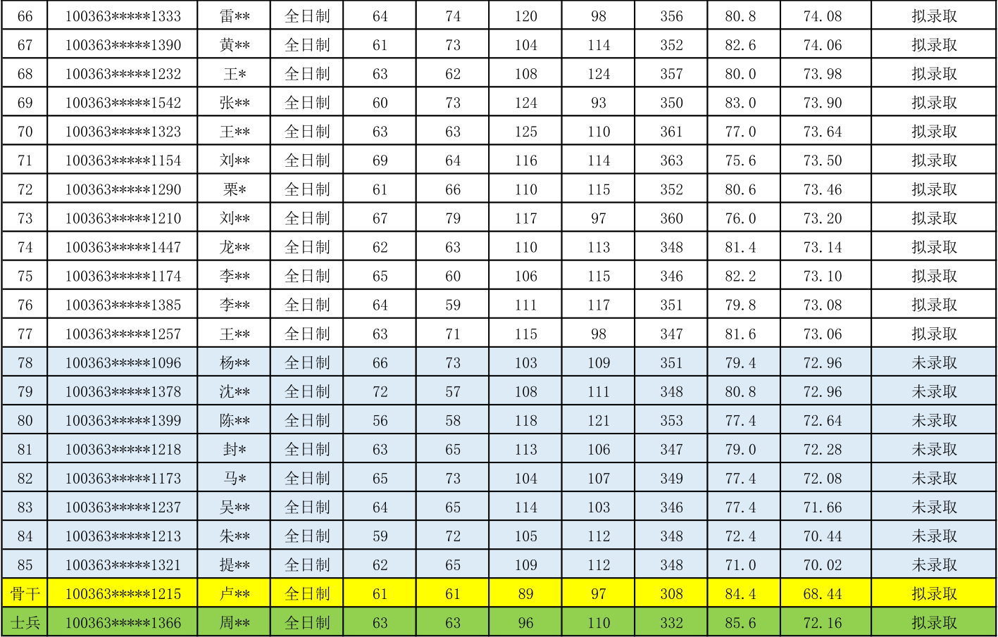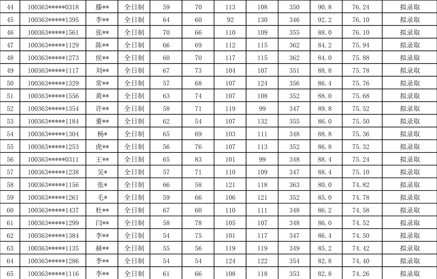 2)对复试合格考生进行差额录取。计算总成绩时,初试成绩、复试成绩均要转化为百分制,即初试成绩满分为500分的,要除以50转化为百分制,300分的要除以3转化为百分制,复试成绩同理处理。初试、复试的成绩(转化为百分制)原则上按7:3的比例加权相加,得出总成绩,并排出名次,根据招生计划差额录取。举例:如一个考生初试成绩为380分(满分500分),复试成绩为85分(满分100分),则最后的加权总成绩为380÷5×70%+85×30%=78.7。