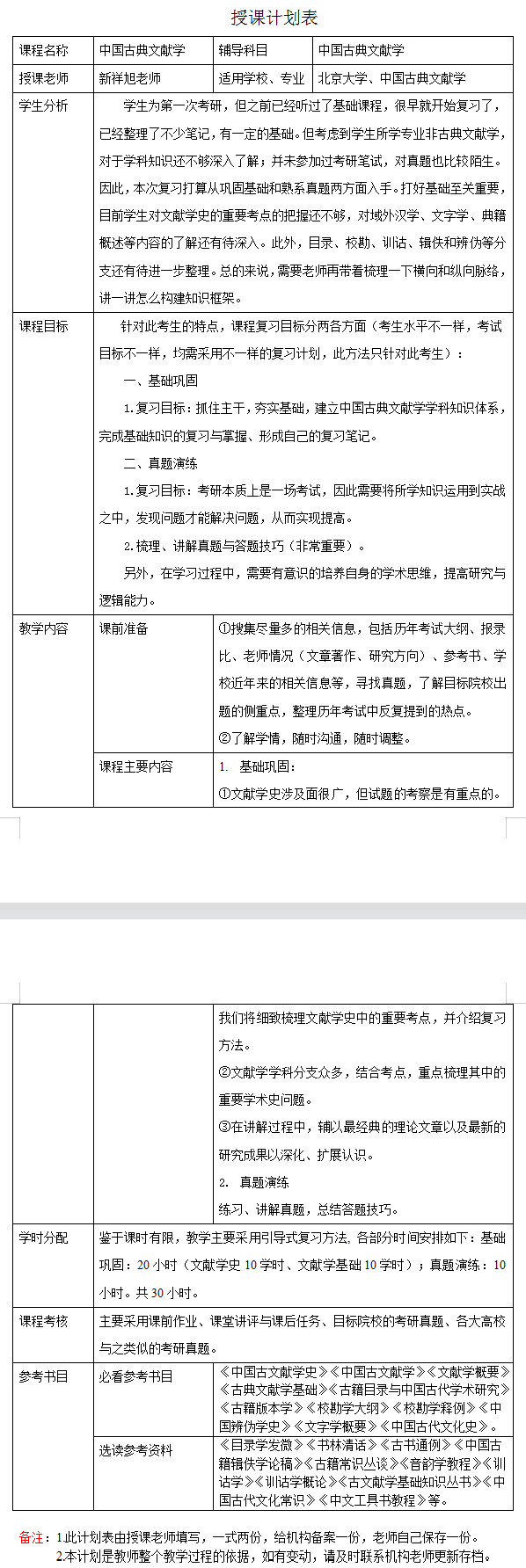 新祥旭考研:2024年北京大学中国古典文献学专业考研一对一辅导授课计划