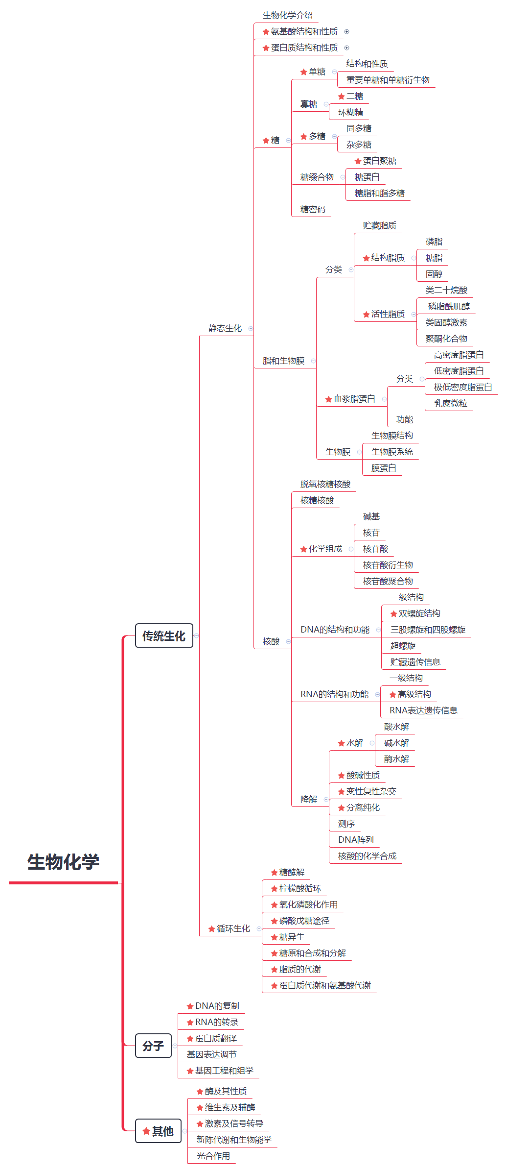 从知识点角度:生物化学分为生化部分、分子部分和其他部分。生化部分包括静态生化、循环生化两大部分。分子部分分为DNA复制、RNA转录,蛋白质翻译,表达调剂,分子工程(基因工程、蛋白质工程)。其他部分包括,酶、维生素和辅酶,激素及其作用,光合作用,新陈代谢。