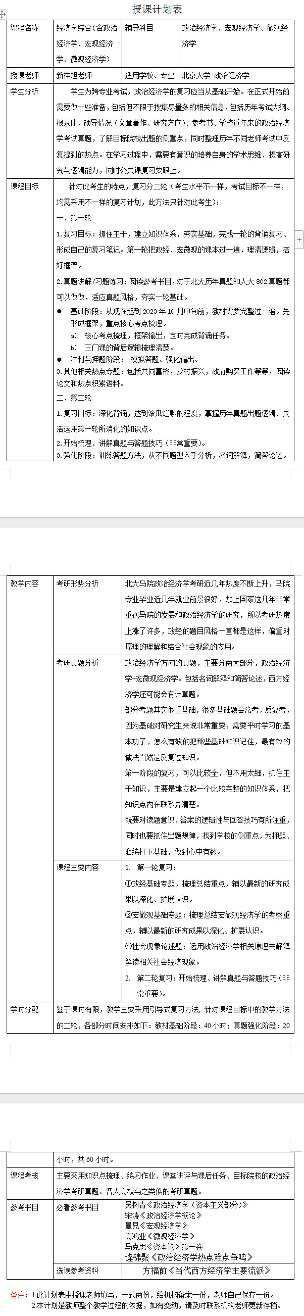 新祥旭考研:2024年北京大学政治经济学专业考研一对一辅导授课计划