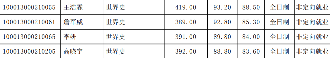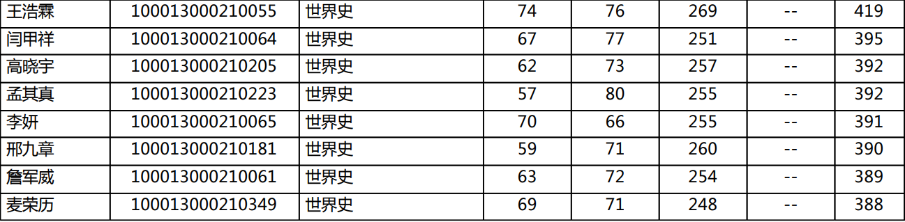 统考计划招生4人,实际录取4人.由录取名单可知录取最低分数线是389分,北大复试有难度很公平,初试分数高,复试发挥不好一样会被刷,初试尽量奔着390+去考,大家需要全力以赴的去备考基础部分:教材是一切科目复习的基础,最经典的教材莫过于吴于廑的《世界史》六卷本,知识点非常全面,可以直接按照书中的思路进行知识框架的整理,千万不要抄书,整理逻辑和要点就可以了,不过因为六卷本出版的年份比较早,很多观点已经不太适用了,这个时候一定要用到的是马克垚的《世界文明史》,马老师的教材同样涵盖了非常多的知识点,且相对于六卷本来说去掉了其中过时的观点,并加入了近些年的学术动态,是报考北大的必读书目。