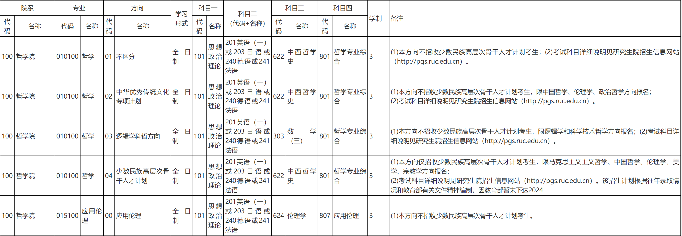 2024中国人民大学哲学院统考专业目录