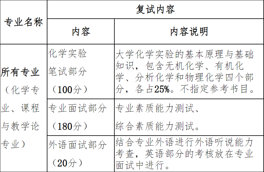 化学专业01—06方向整体排序,07方向单独排序,根据考生总成绩从高到低依次录取。课程与教学论专业按专业,根据考生总成绩从高到低依次录取。总成绩相同时,按初试总分从高到低依次录取。复试不合格考生不予录取。