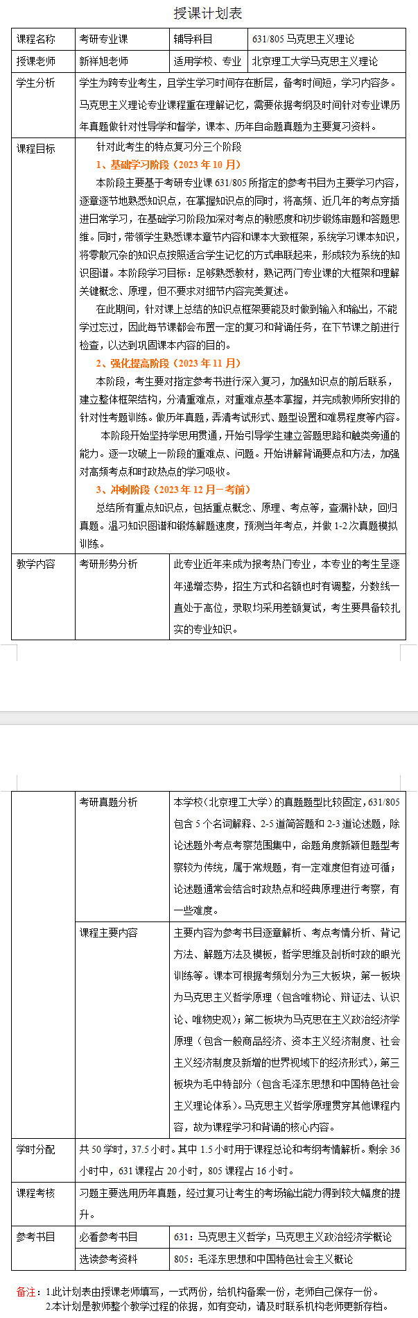 新祥旭考研:2024年北京理工大学马克思主义理论考研一对一辅导授课计划