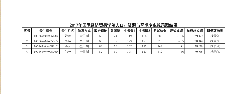 2017年对外经济贸易大学人口、资源与环境经济学专业研究生拟录取名单