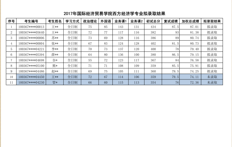 2017年对外经济贸易大学西方经济学专业研究生拟录取名单