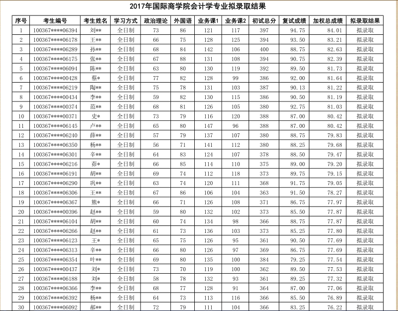 2017年对外经济贸易大学会计学研究生拟录取名单