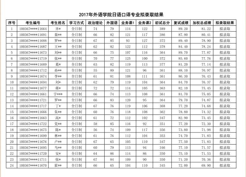 2017年对外经济贸易大学日语口译(专业型)研究生拟录取名单