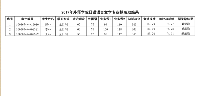 2017年对外经济贸易大学日语语言文学研究生拟录取名单