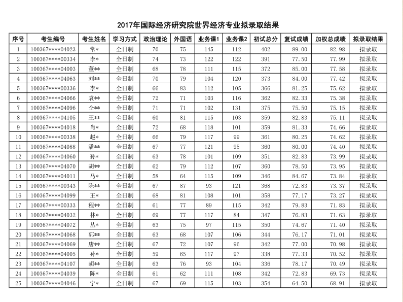 2017年对外经济贸易大学国际经济研究院世界经济研究生拟录取名单