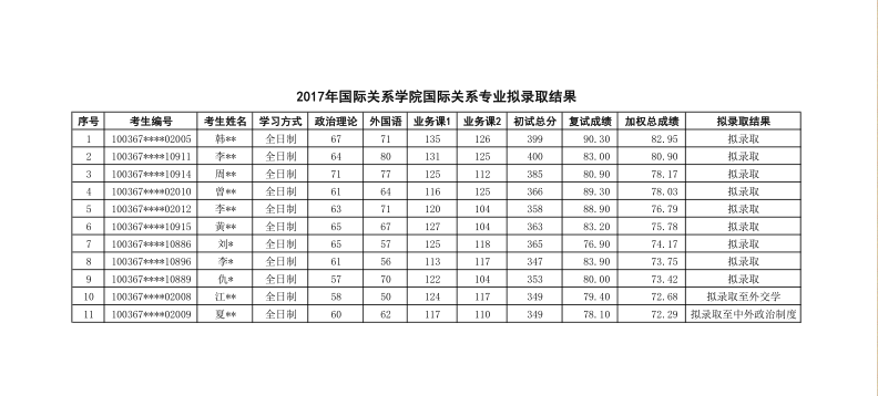 2017年对外经济贸易大学国际关系研究生拟录取名单