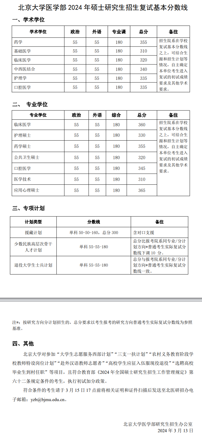 北京大学医学部2024年硕士研究生招生复试基本分数线