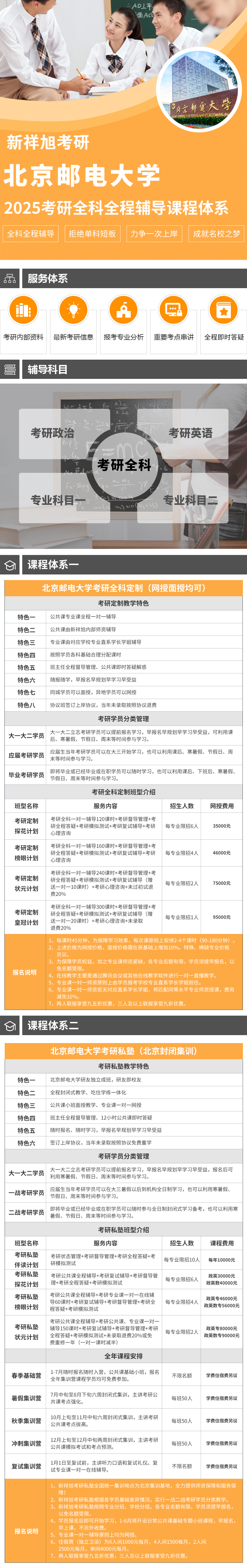 新祥旭考研机构开设有北京邮电大学考研私塾课程,北京邮电大学考研私塾为北京邮电大学考研学子提供专属的封闭式集训学习环境,考研私塾全程封闭式教学、吃住学练一体化;公共课小班面授教学(PS:若公共课某科特别弱亦可单独再另咨一对一针对性补习)、专业课一对一面授或网授;班主任全程督导管理、公共课专业课即时免费答疑。考研学员随报随学,专业务实,真诚周到,助力上岸!