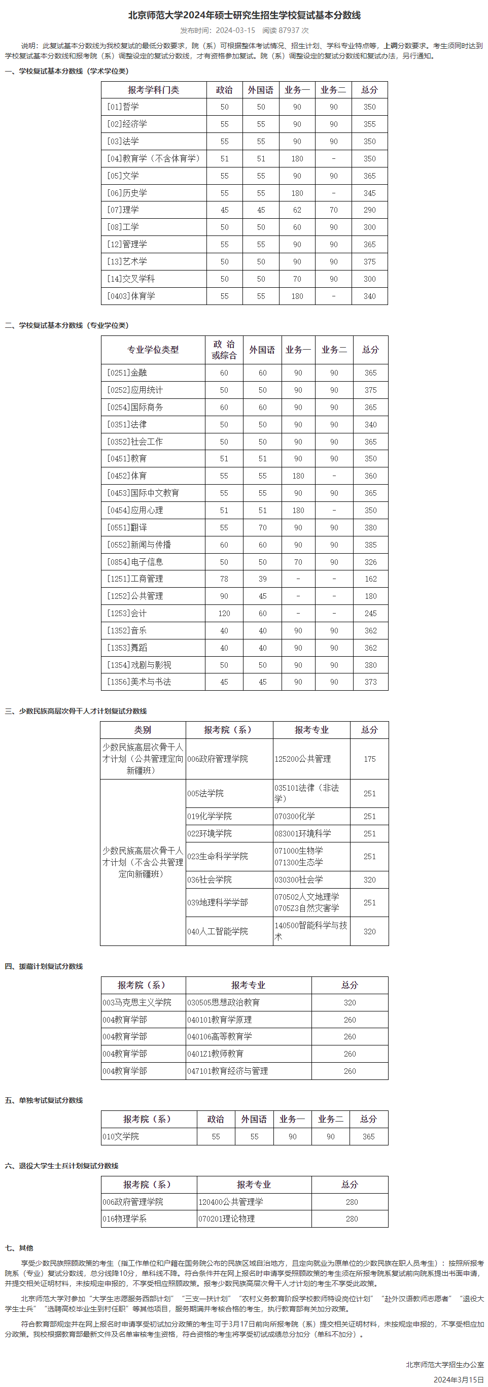 一、2024年北京师范大学硕士研究生招生复试基本分数线