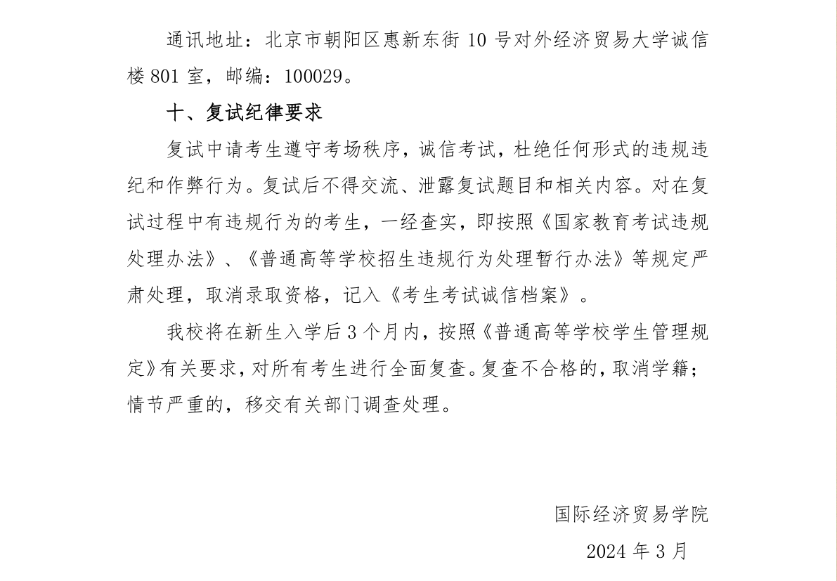 对外经济贸易大学国际经济贸易学院2024年硕士研究生招生考试复试方案