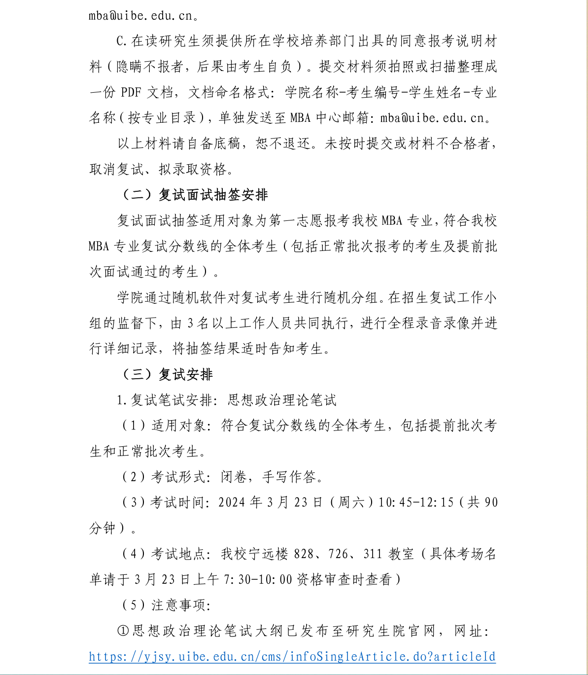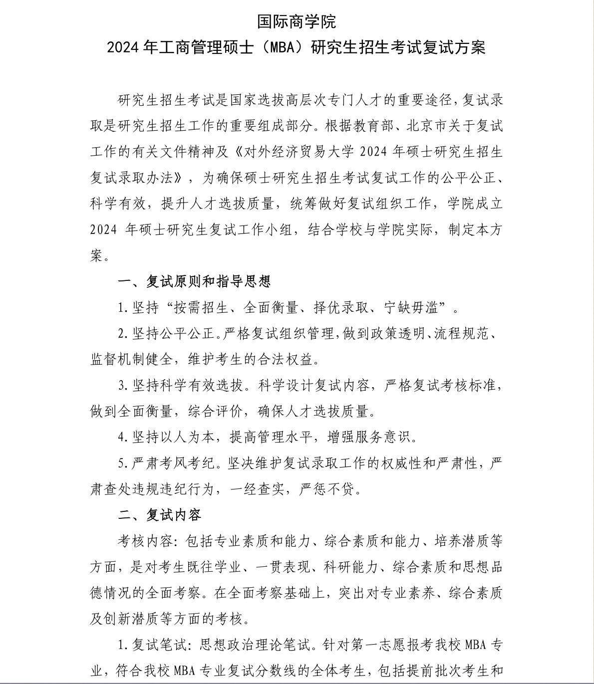 对外经济贸易大学国际商学院工商管理硕士(MBA)2024年硕士研究生招生考试复试方案