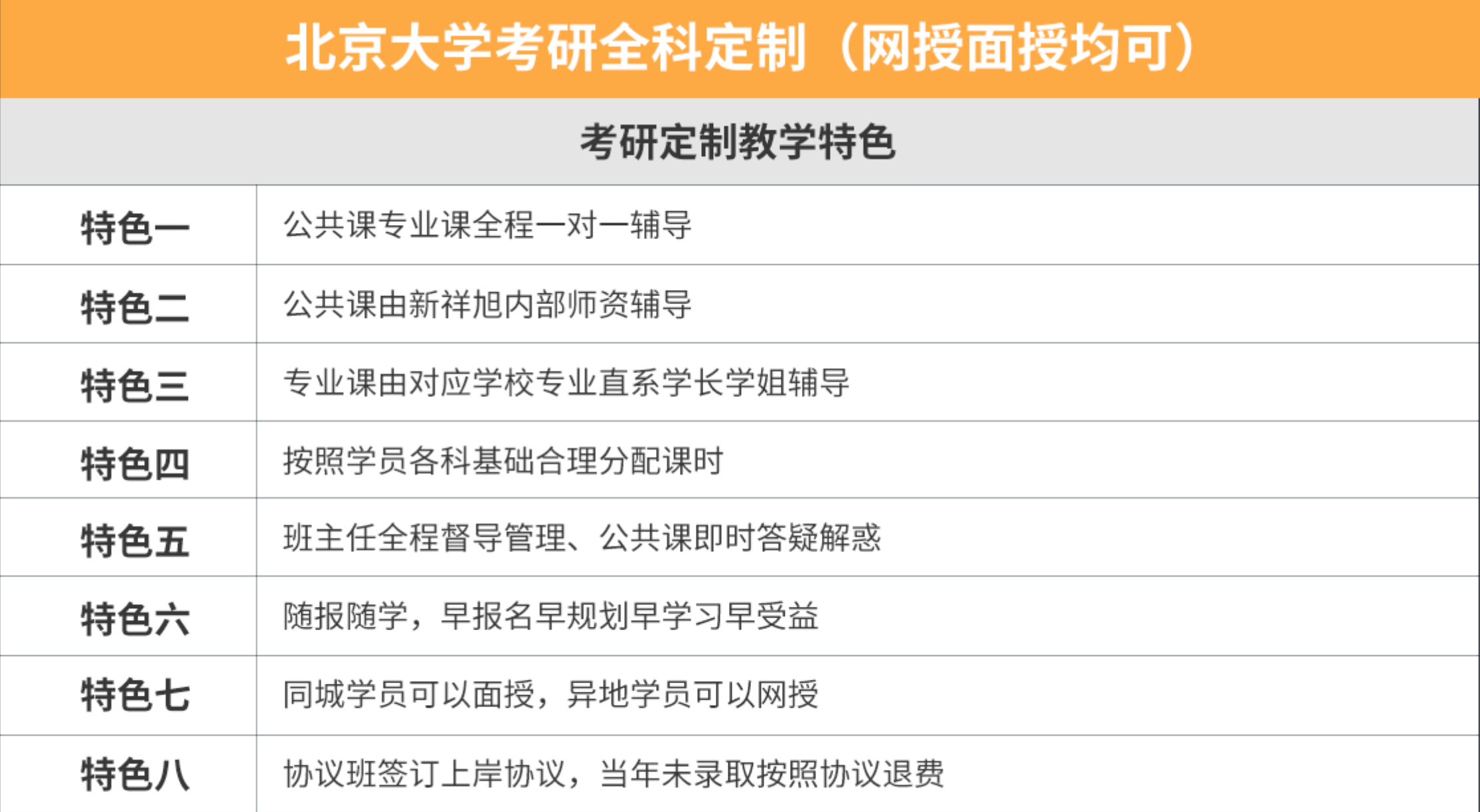新祥旭考研专注北京大学考研全科定制辅导,以效果为导向,以上岸为目标,为广大考研学生提供个性化、定制化、多对一的考研全科全程辅导,考研公共课和考研专业课皆为一对一辅导,全国各地考研学生可以面授也可以网授,力争让考研学生顺利考取北京大学攻读硕士研究生。