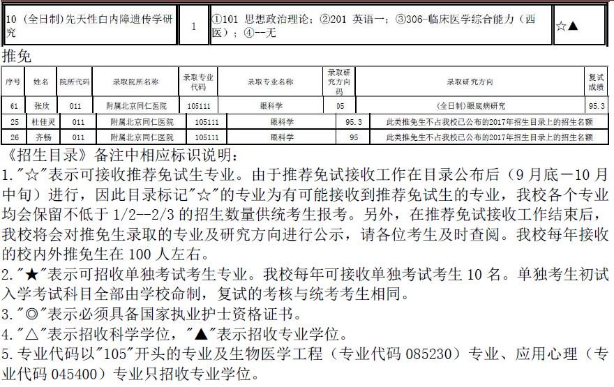 2017年首都医科大学105111眼科学招生目录、推免名单