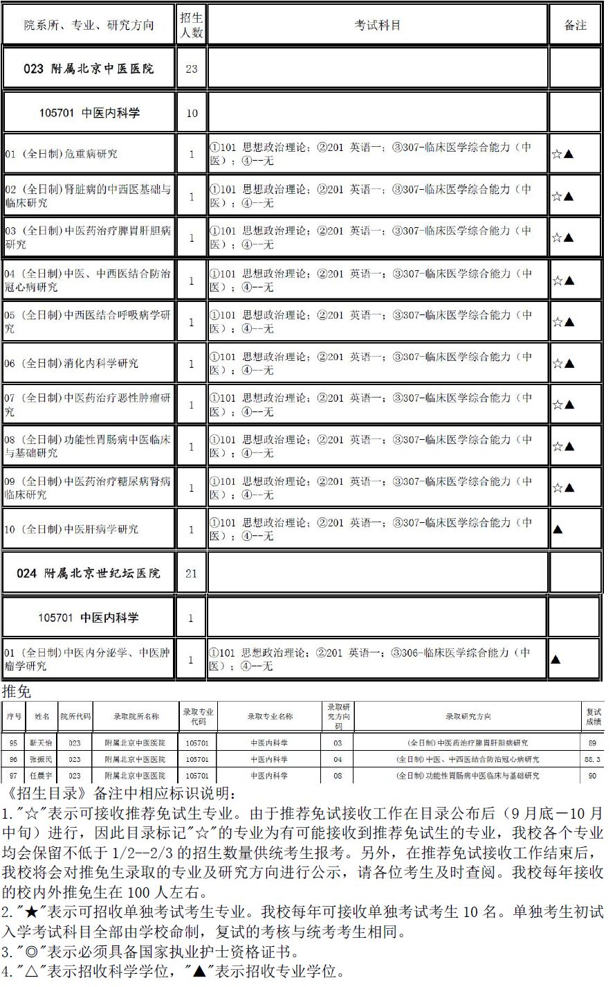2017年首都医科大学105701中医内科学招生目录、推免名单