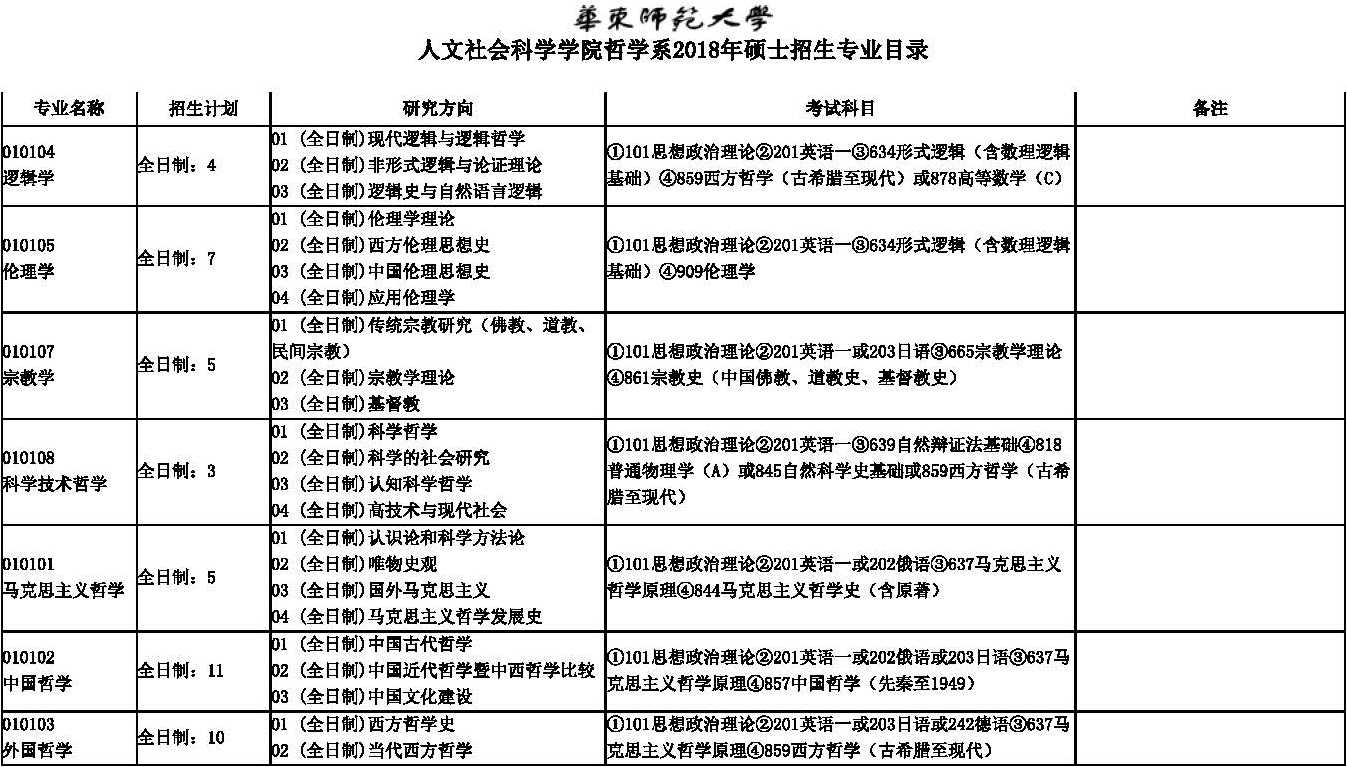 华东师范大学哲学系2018年硕士研究生招生人数、招生目录