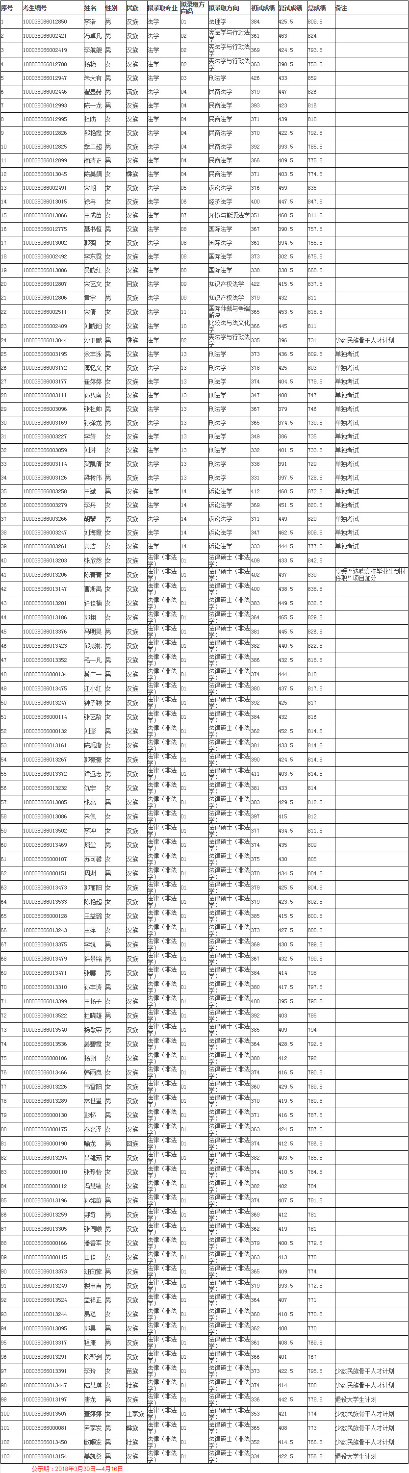 清华大学法学院2018年硕士研究生拟录取名单