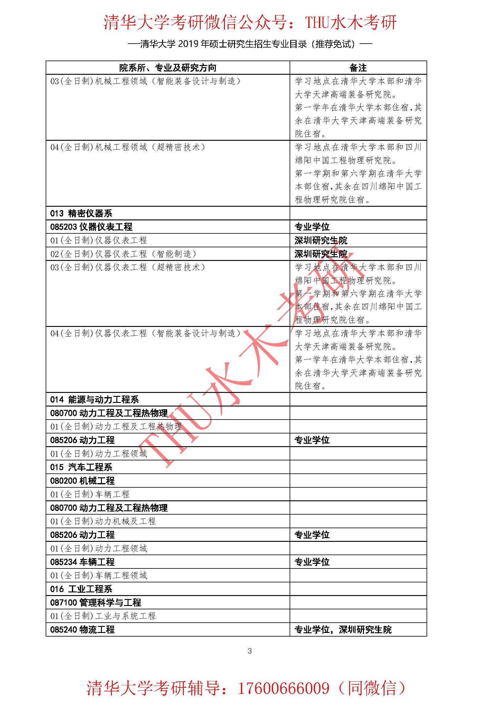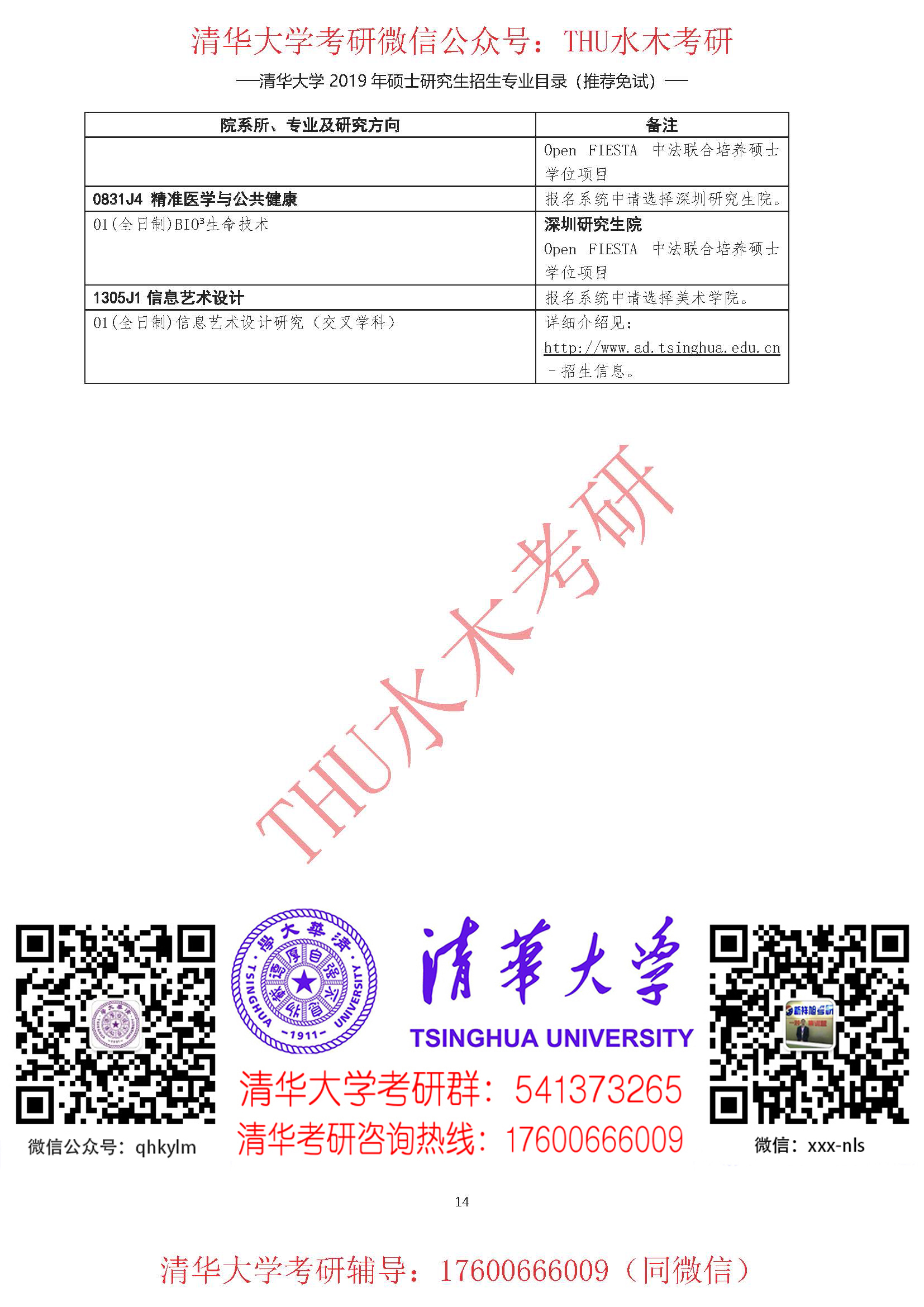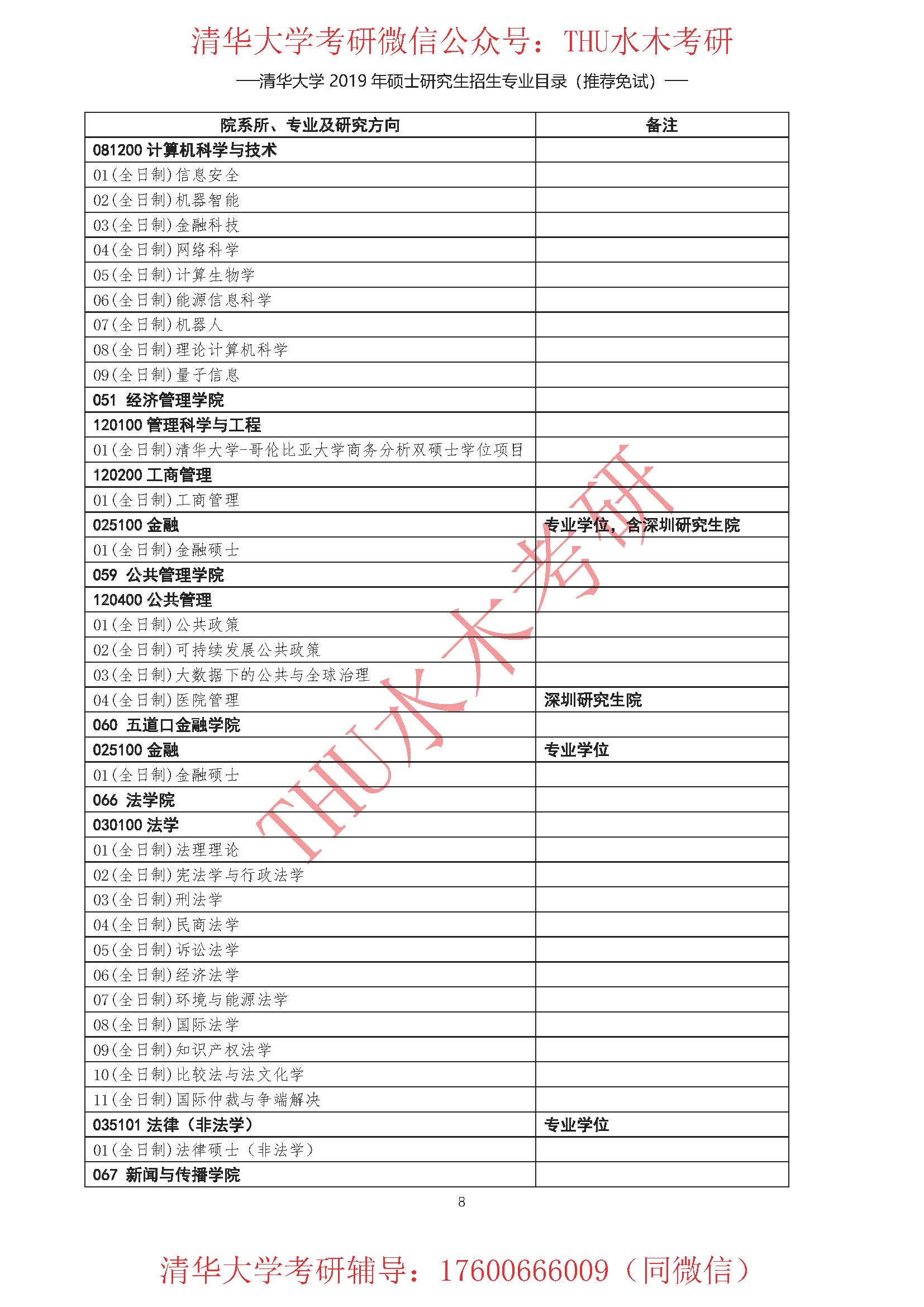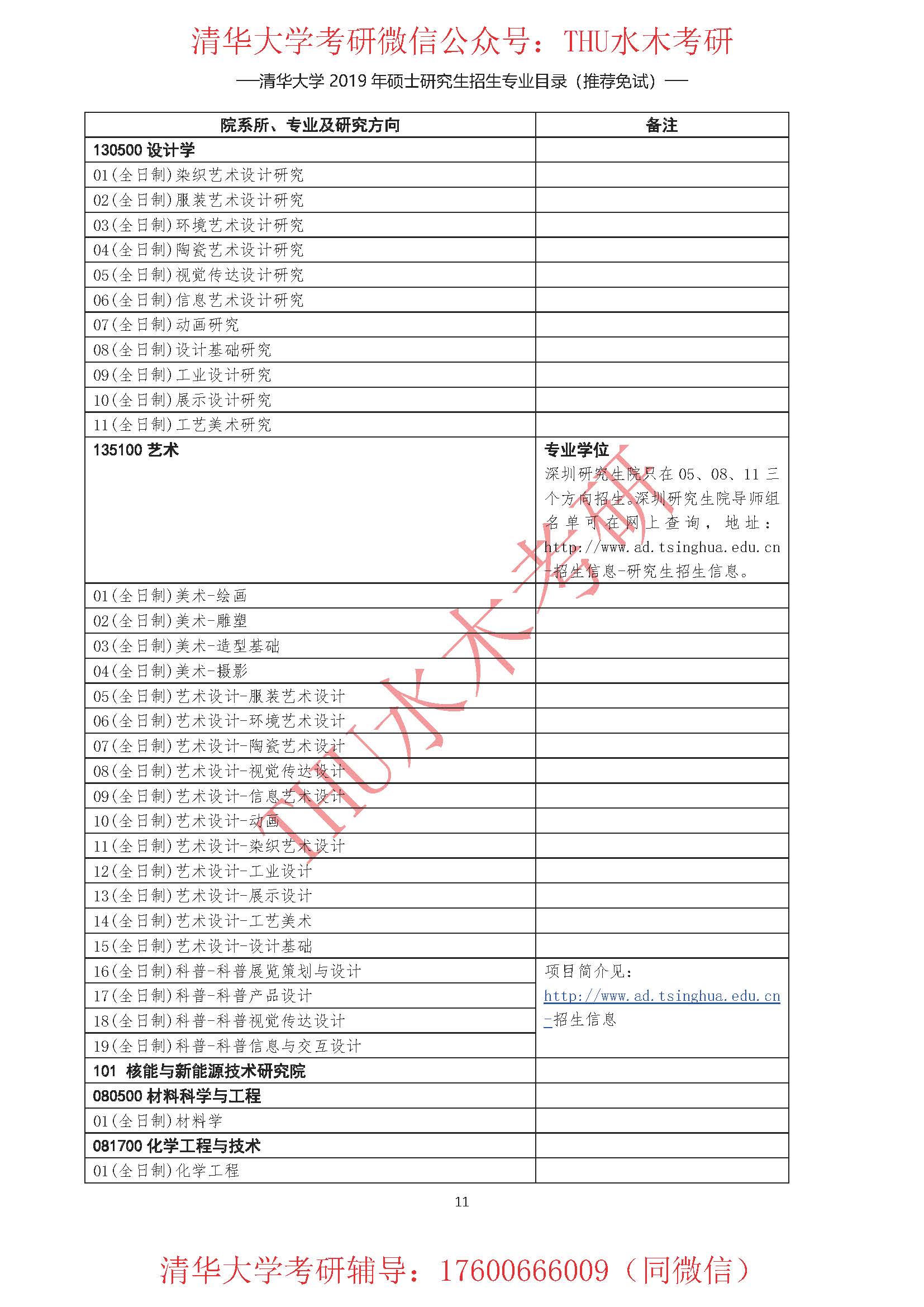 清华大学2019年硕士研究生推荐免试招生专业目录