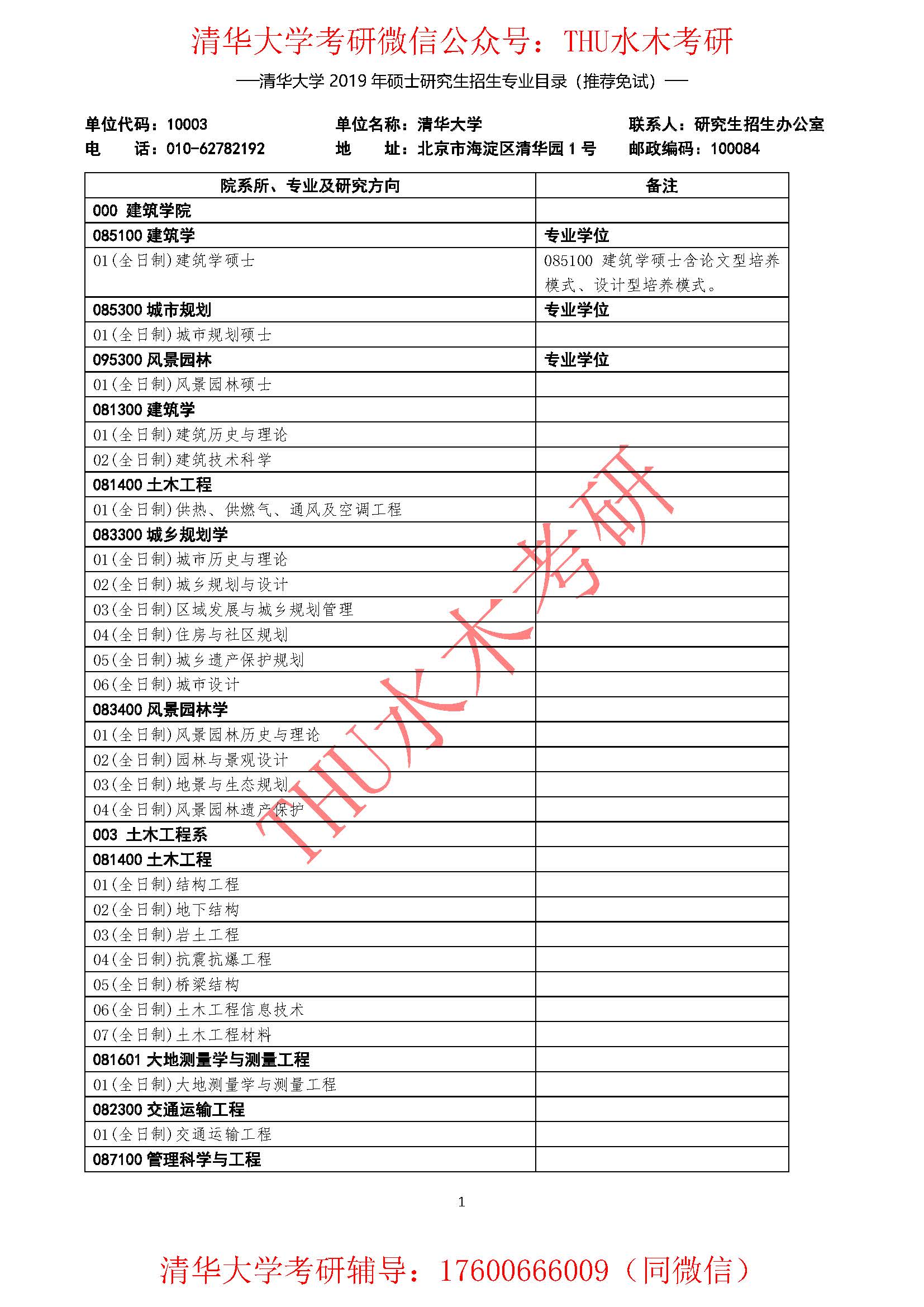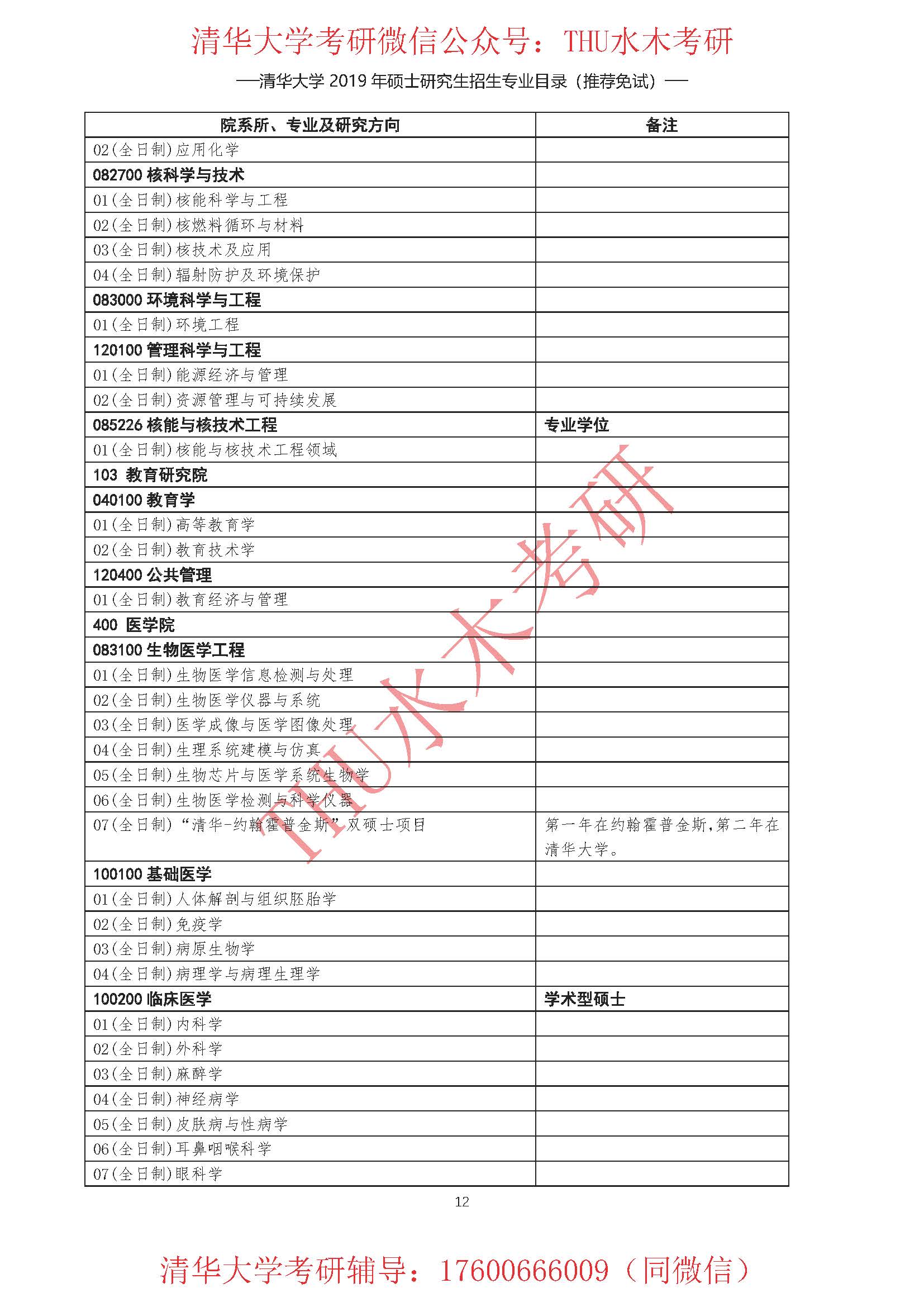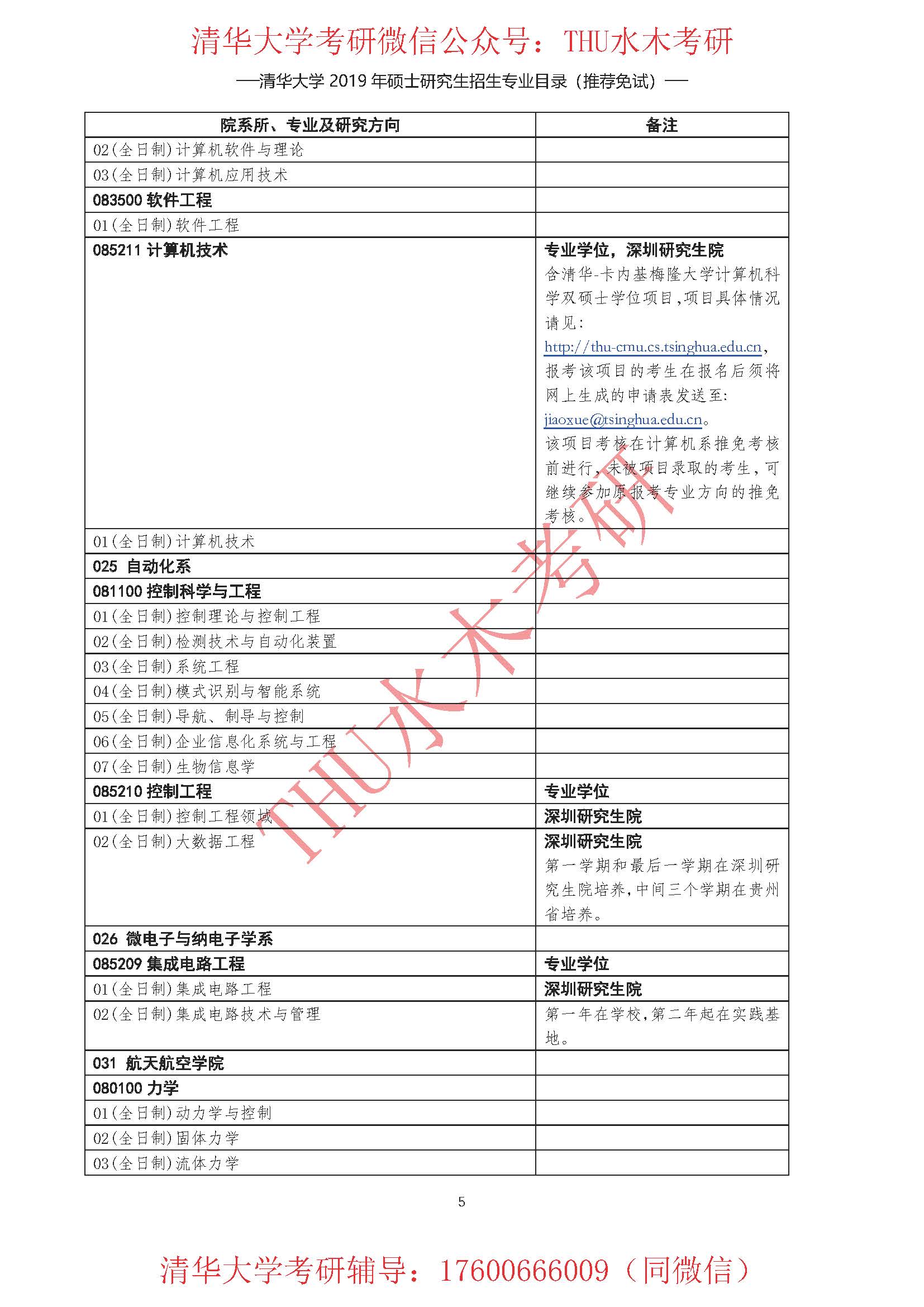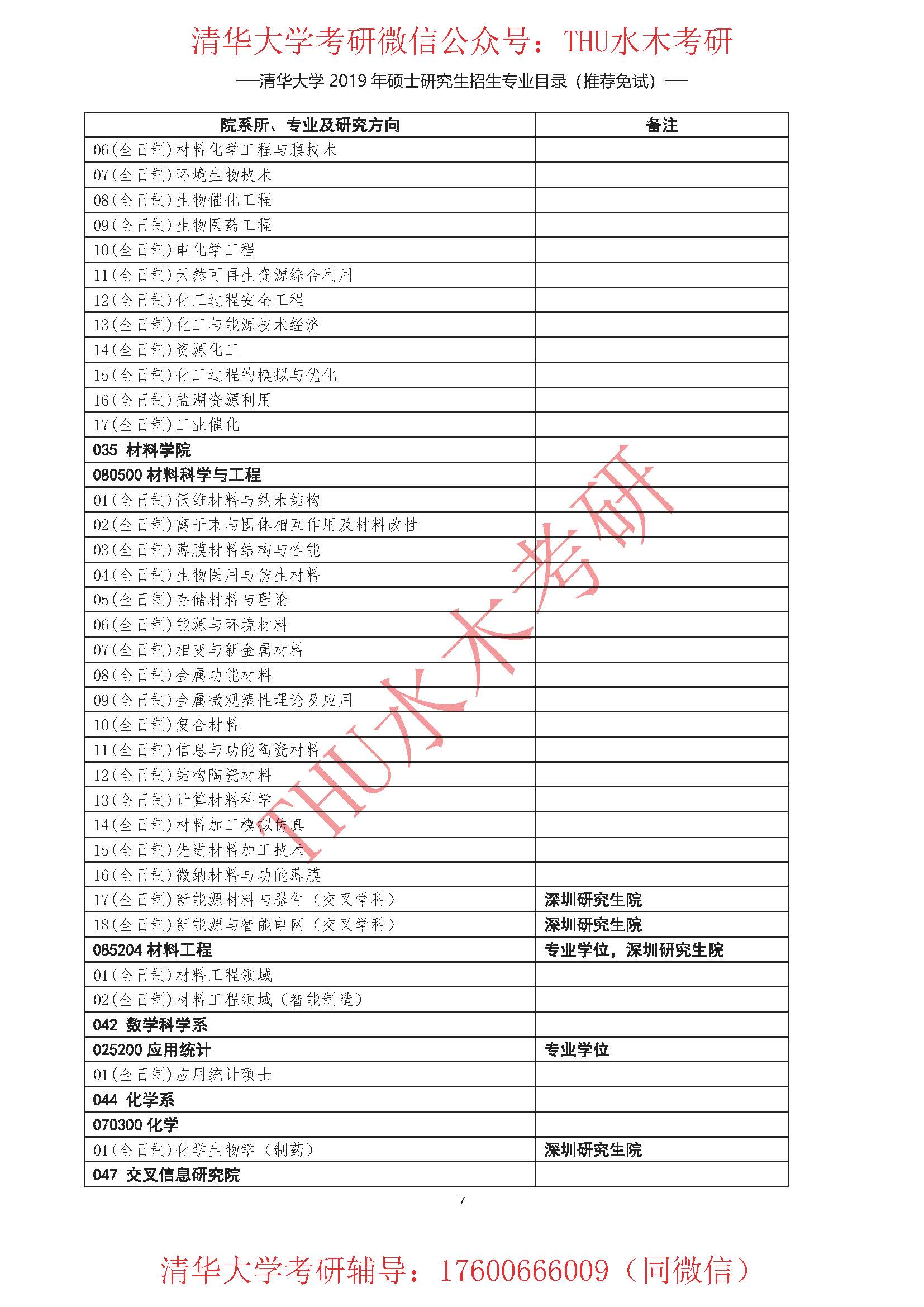 清华大学2019年硕士研究生推荐免试招生专业目录