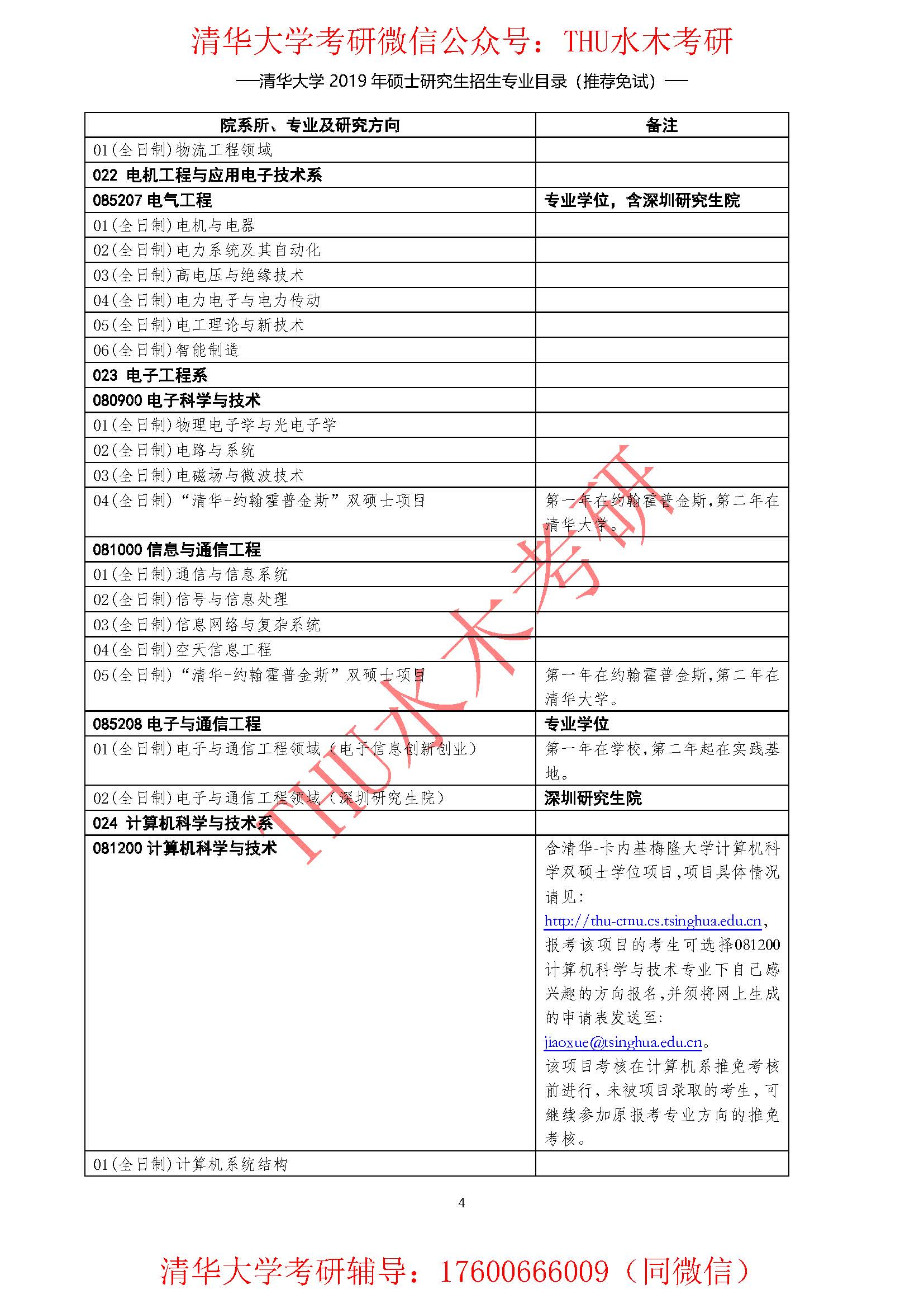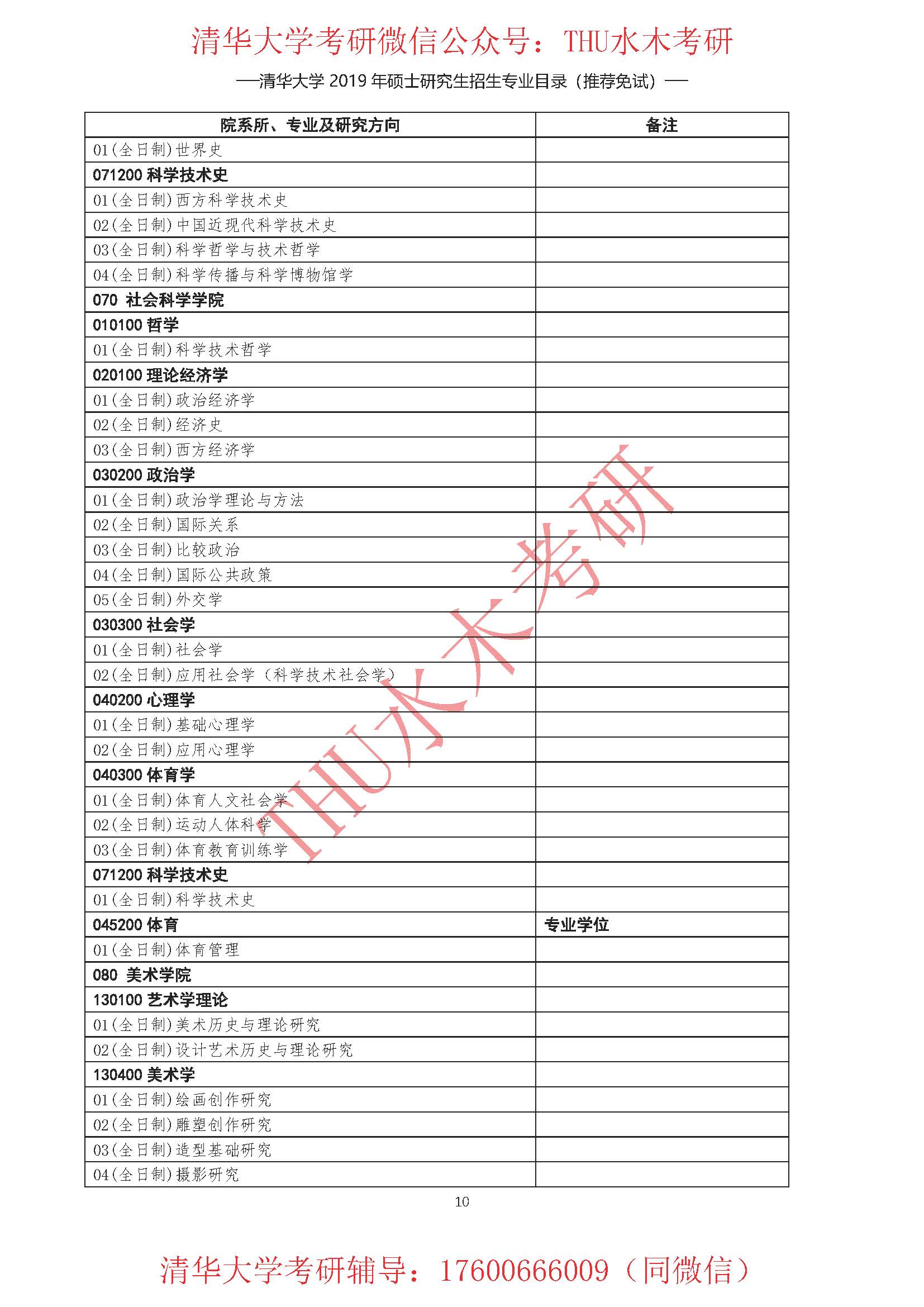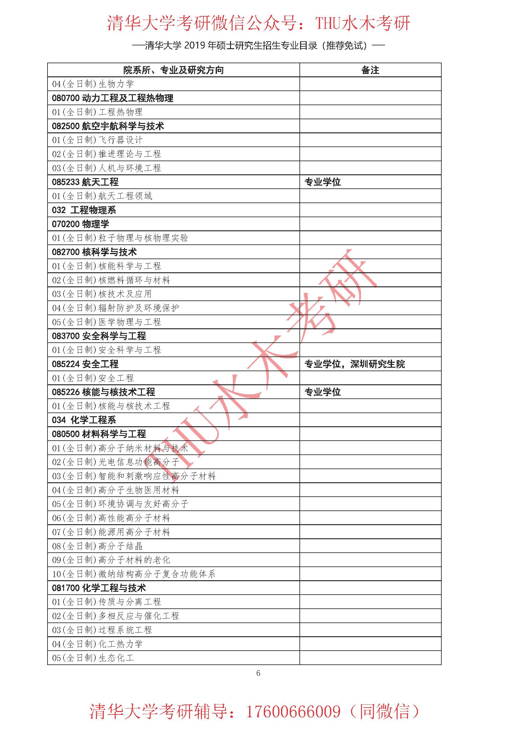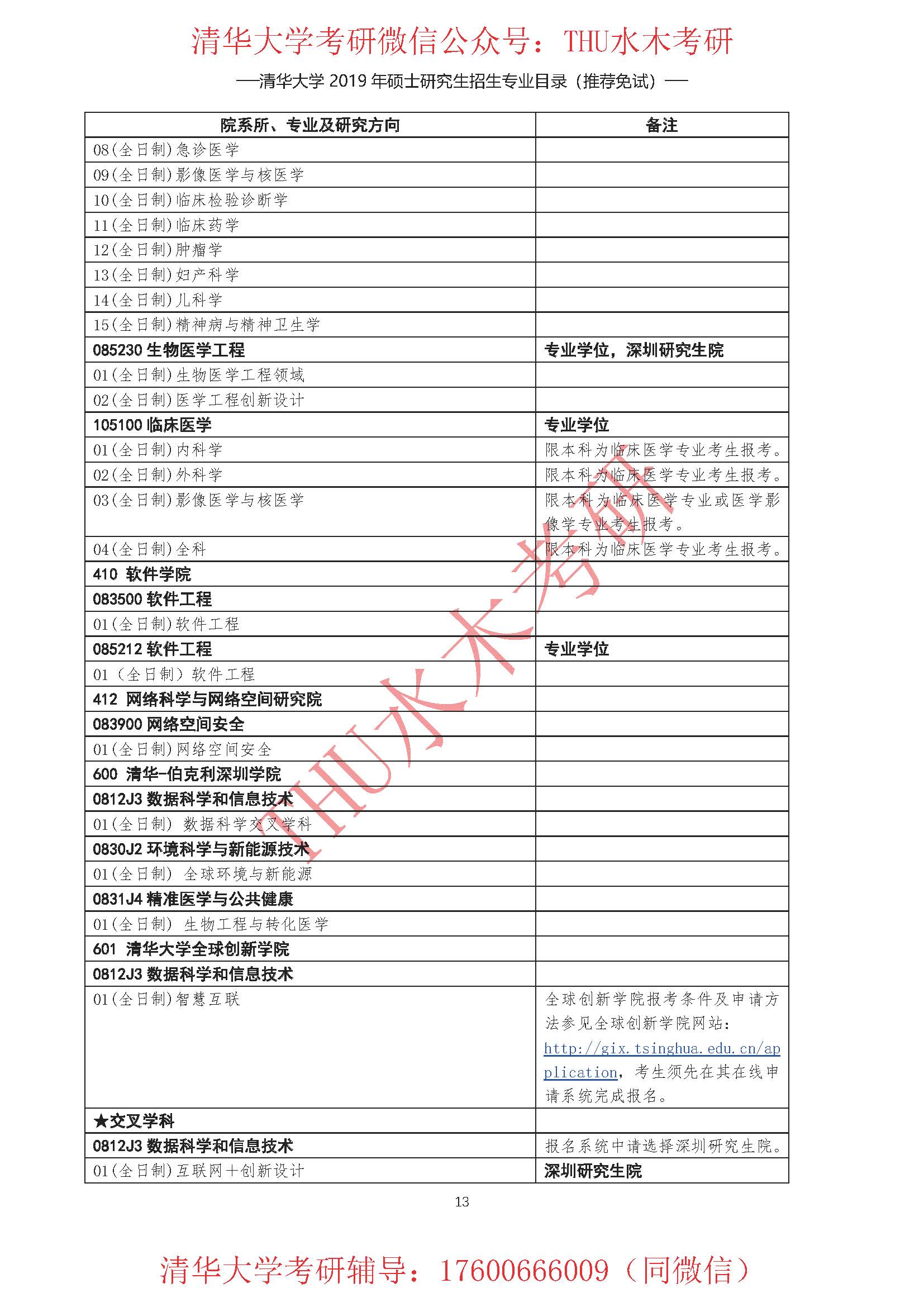 清华大学2019年硕士研究生推荐免试招生专业目录