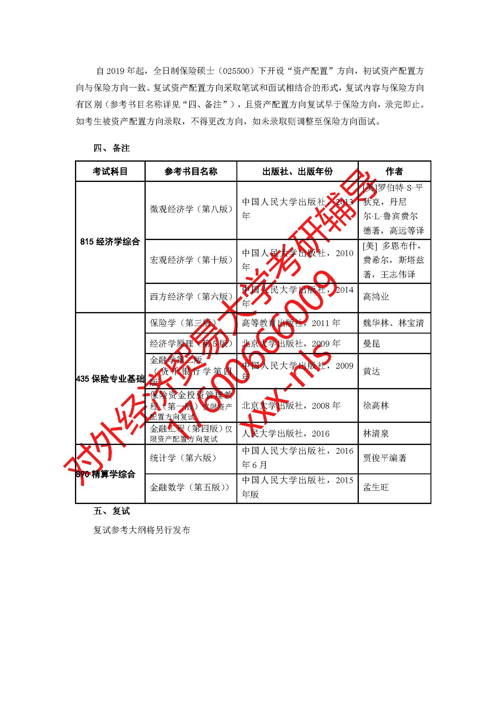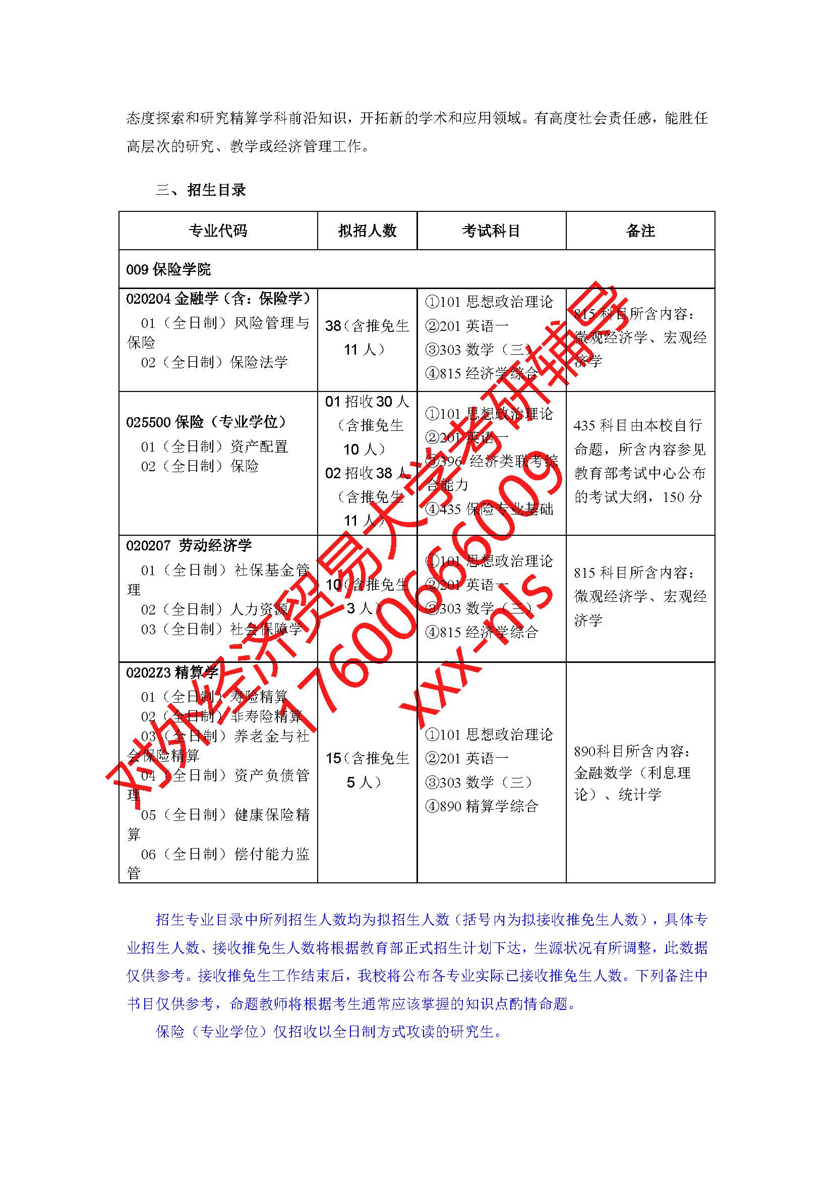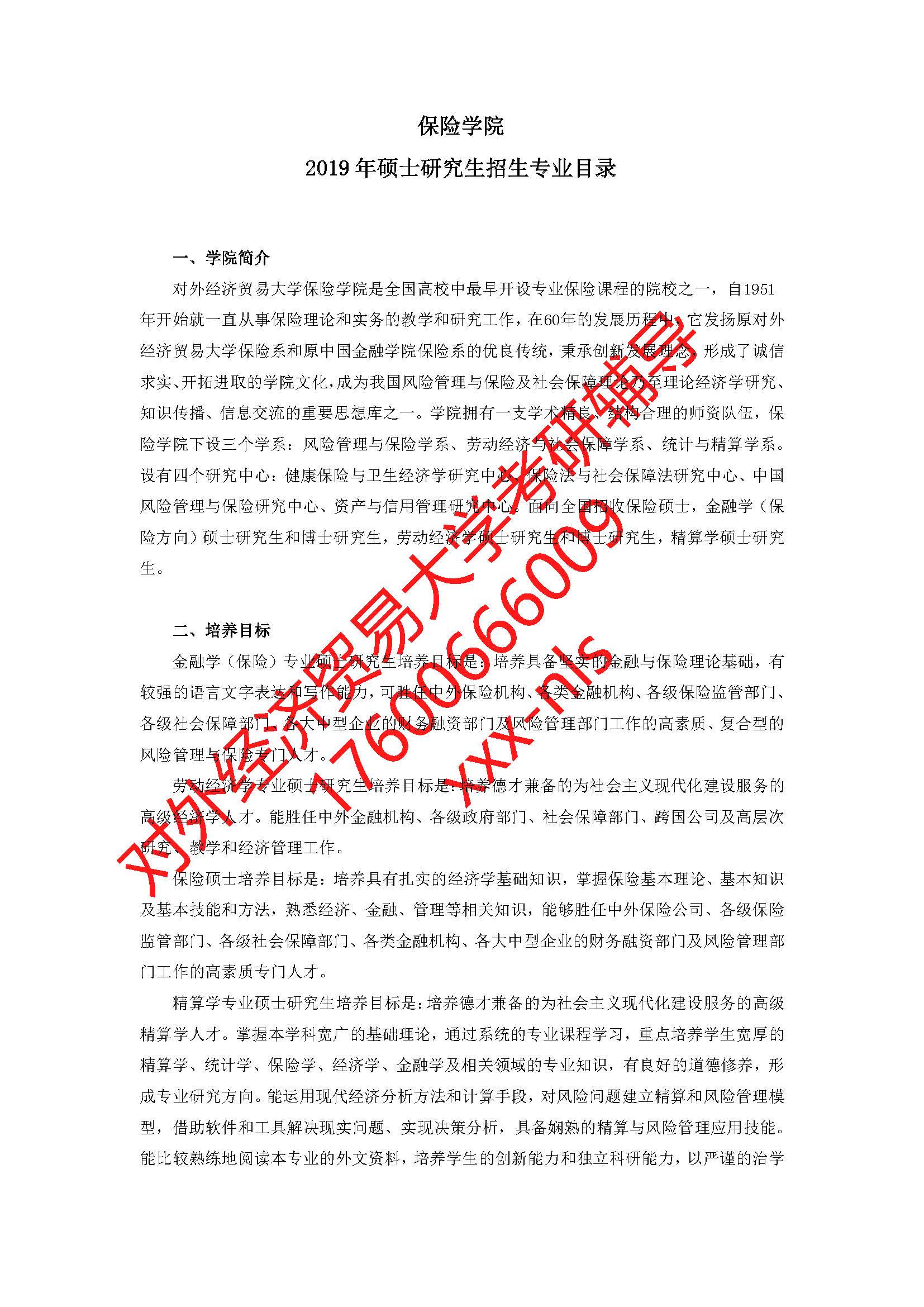 对外经济贸易大学保险学院2019年硕士研究生招生专业目录