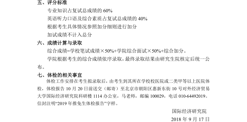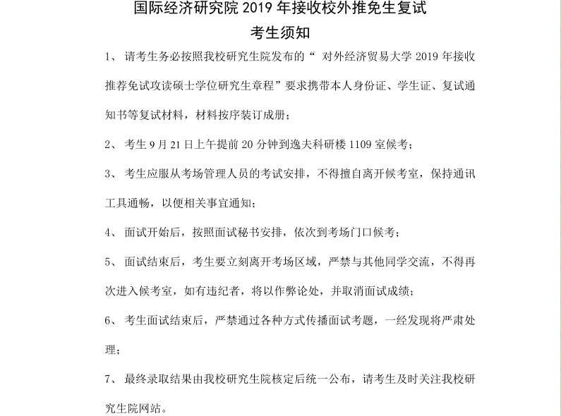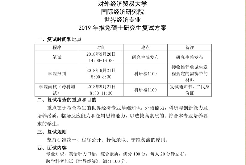 对外经济贸易大学国际经济研究院2019年接收推荐免试生复试工作方案