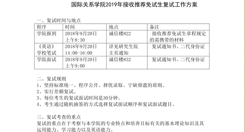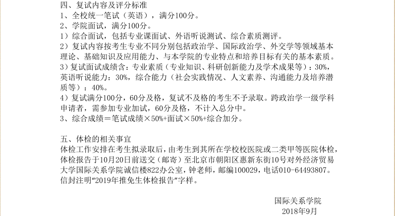 对外经济贸易大学国际关系学院2019年接收推荐免试生复试工作方案