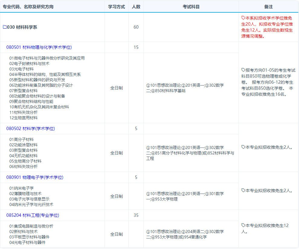 2019年复旦大学材料科学系考研招生专业、招生人数、考试科目