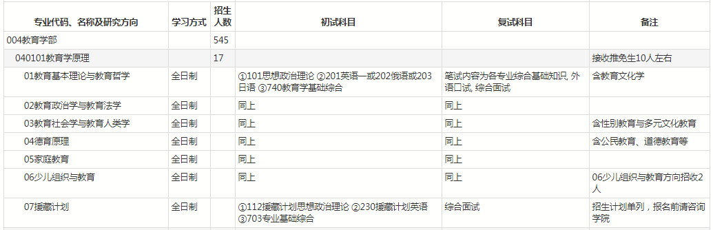 2) 录取方式:总成绩=初试总分+复试总分。040102课程与教学论01-05方向考生一起排队、06方向考生单独排队录取,047101教育经济与管理按方向录取,其他均按专业录取。按照总成绩从高到低依次录取。第一志愿上线复试合格考生优先,调剂考生单独排序。