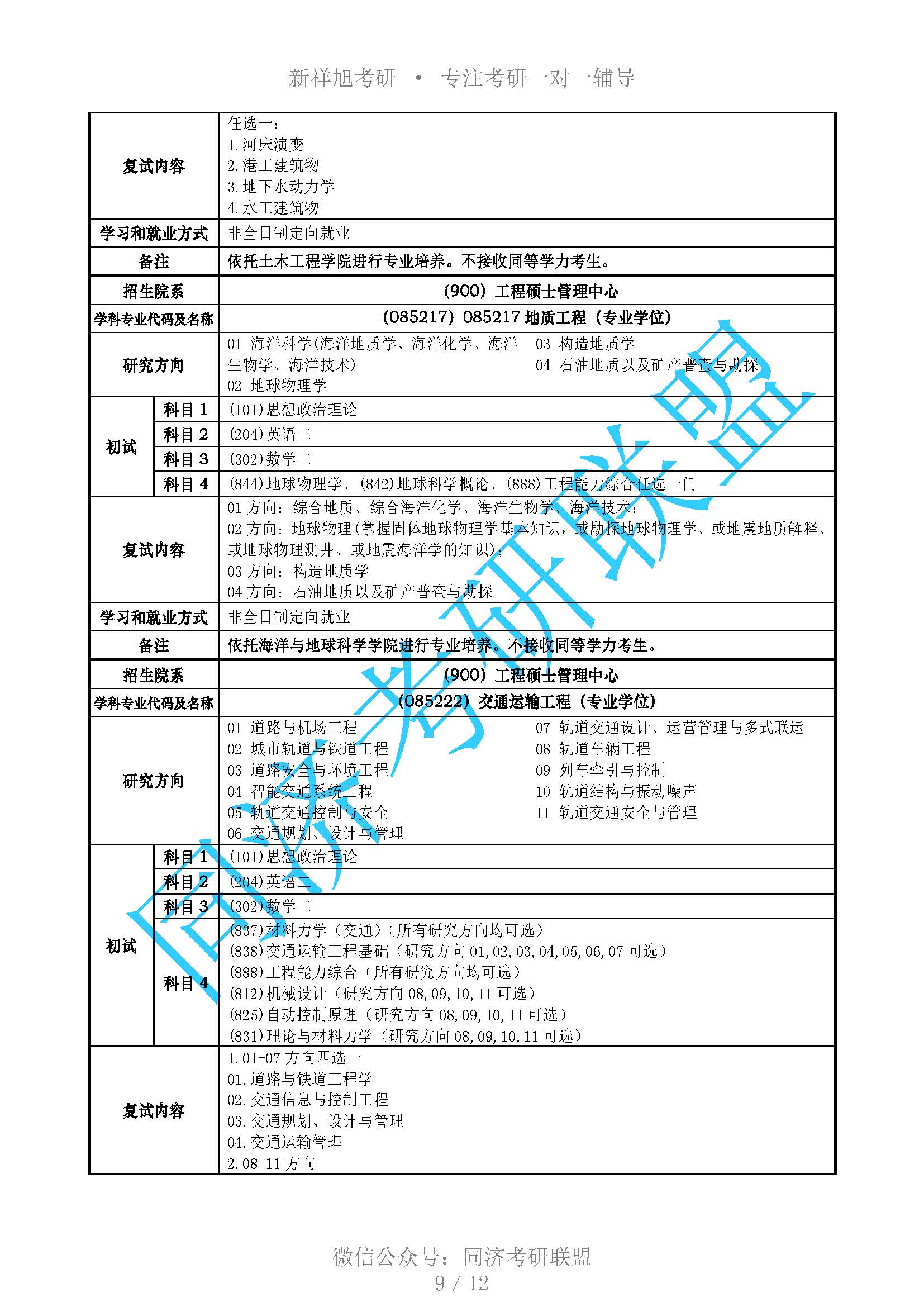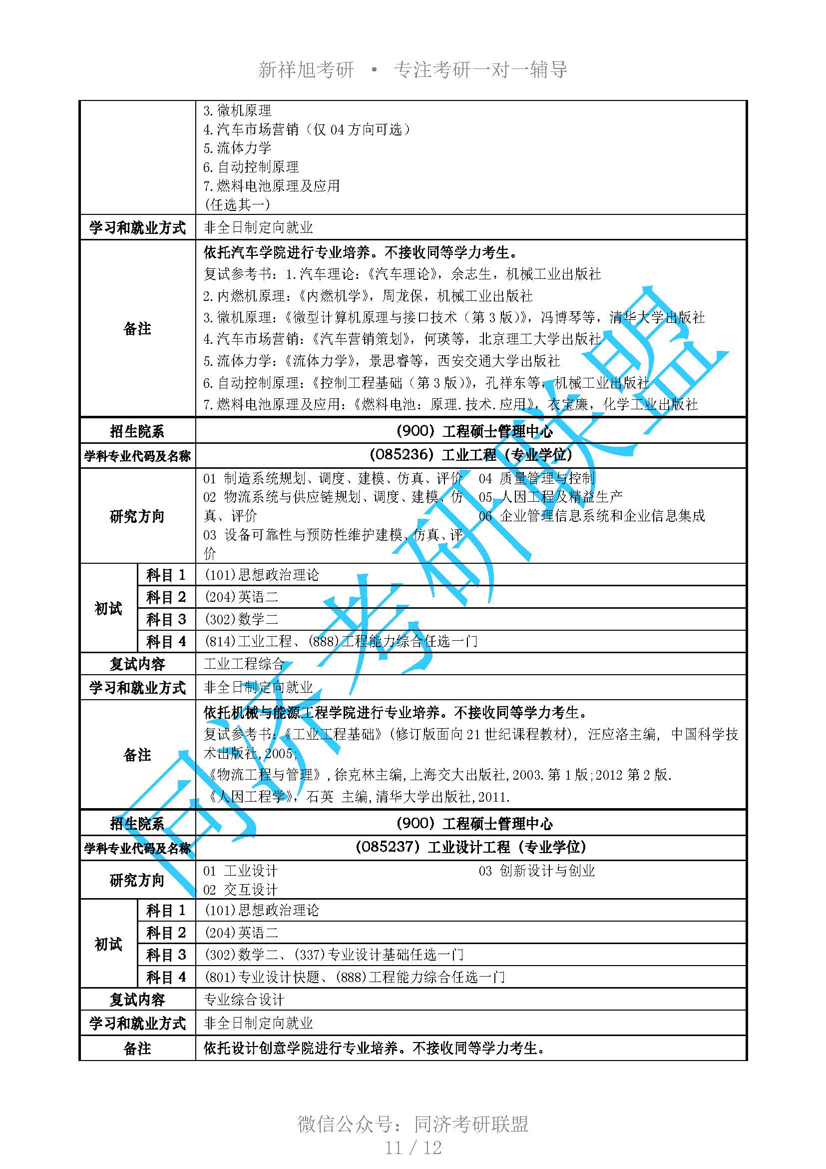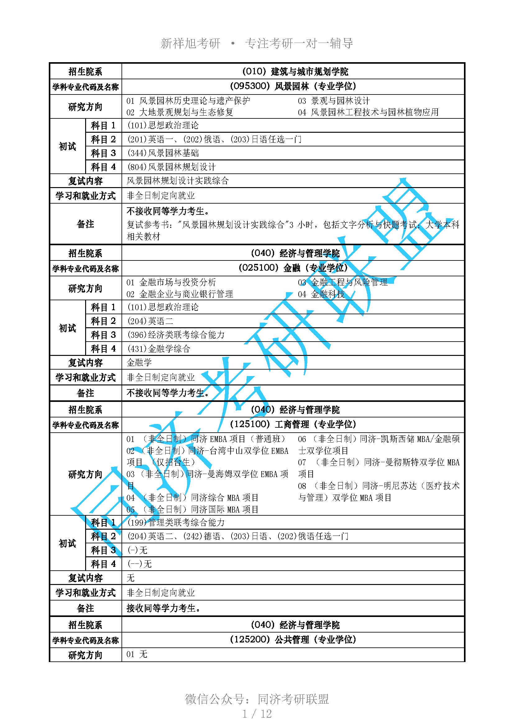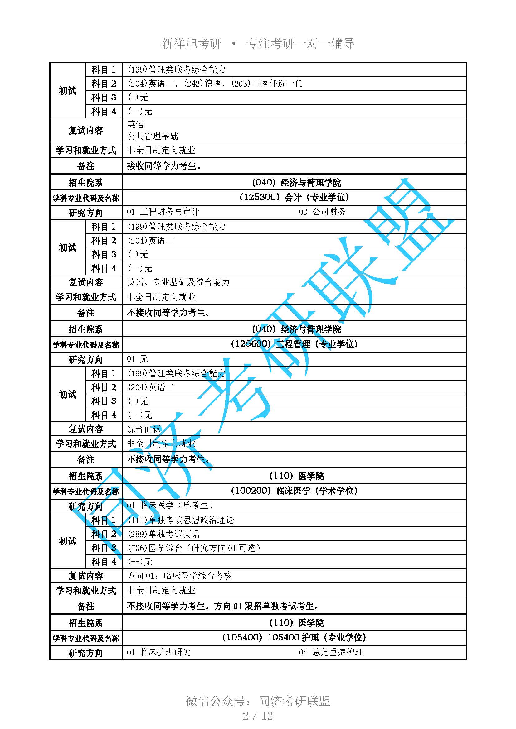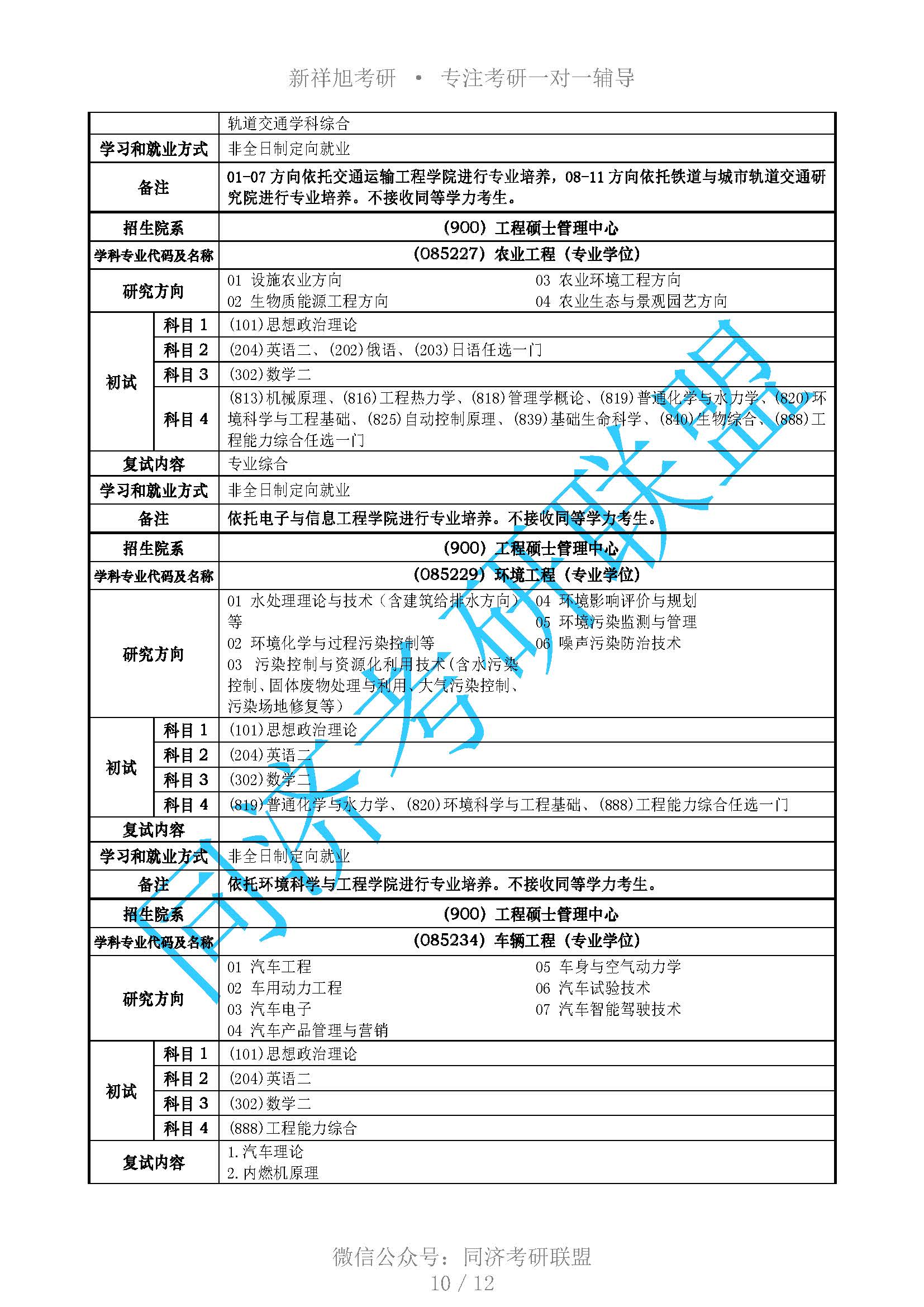 同济大学2019年专业硕士研究生招生专业目录、考试科目