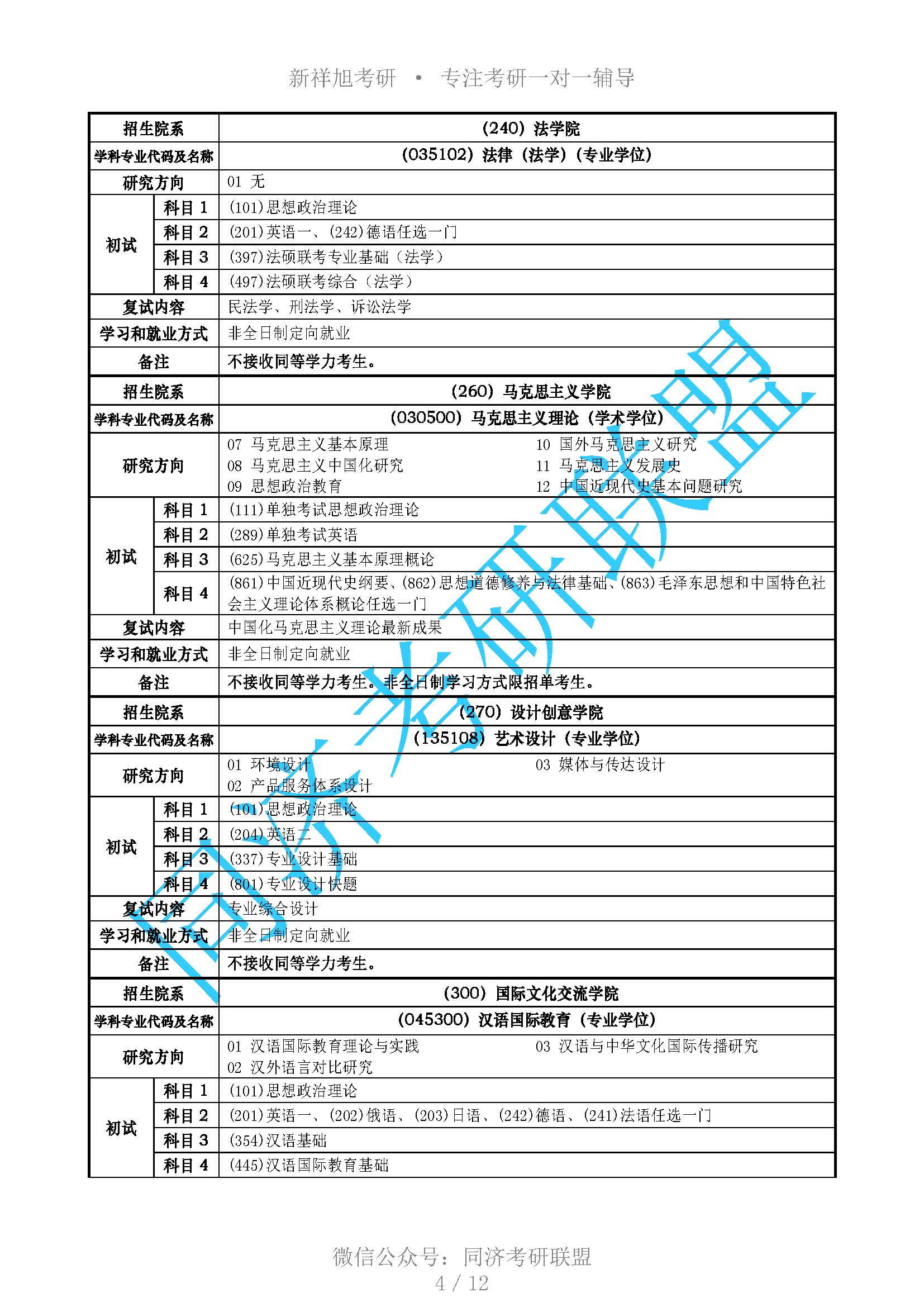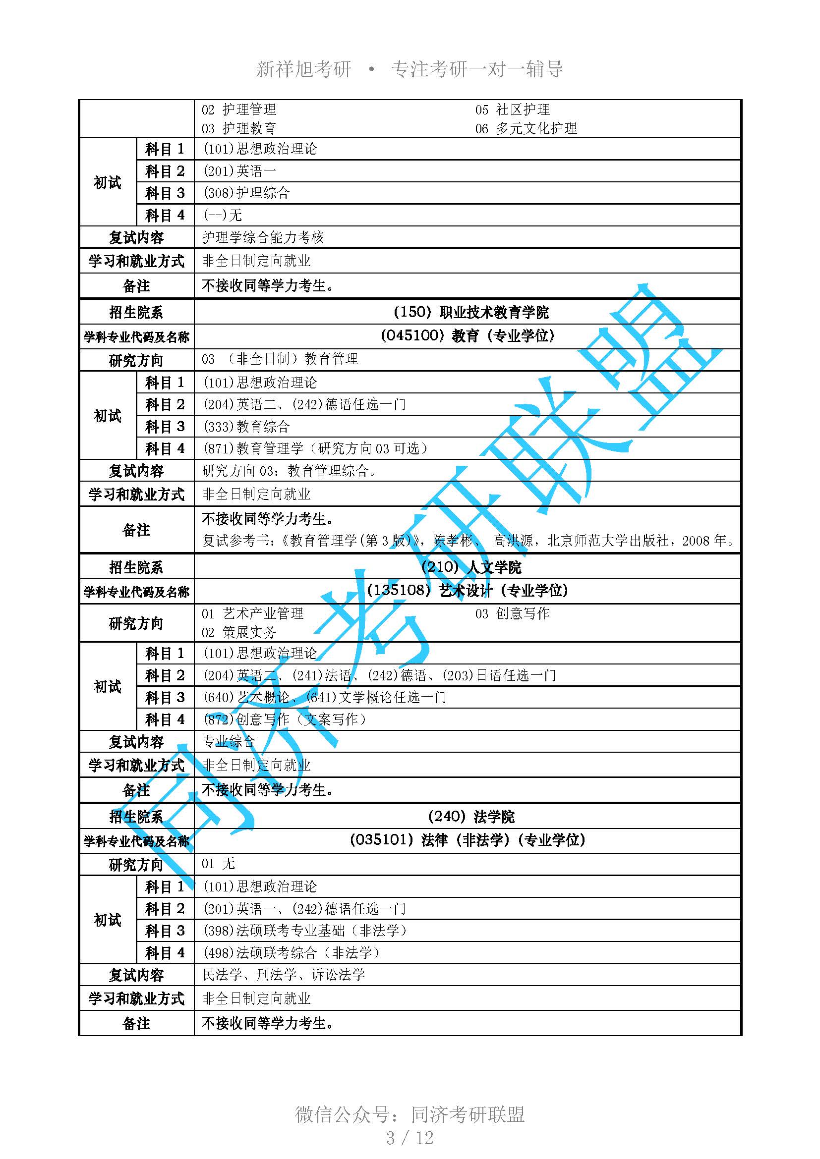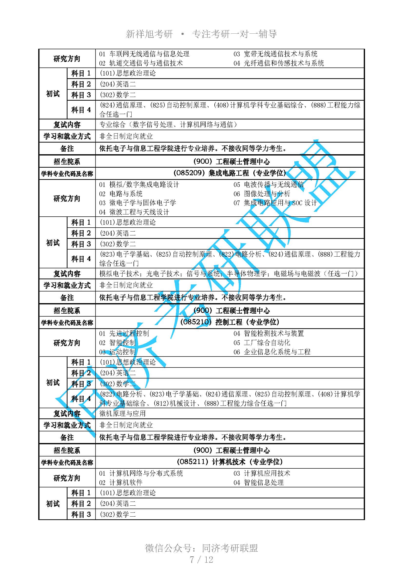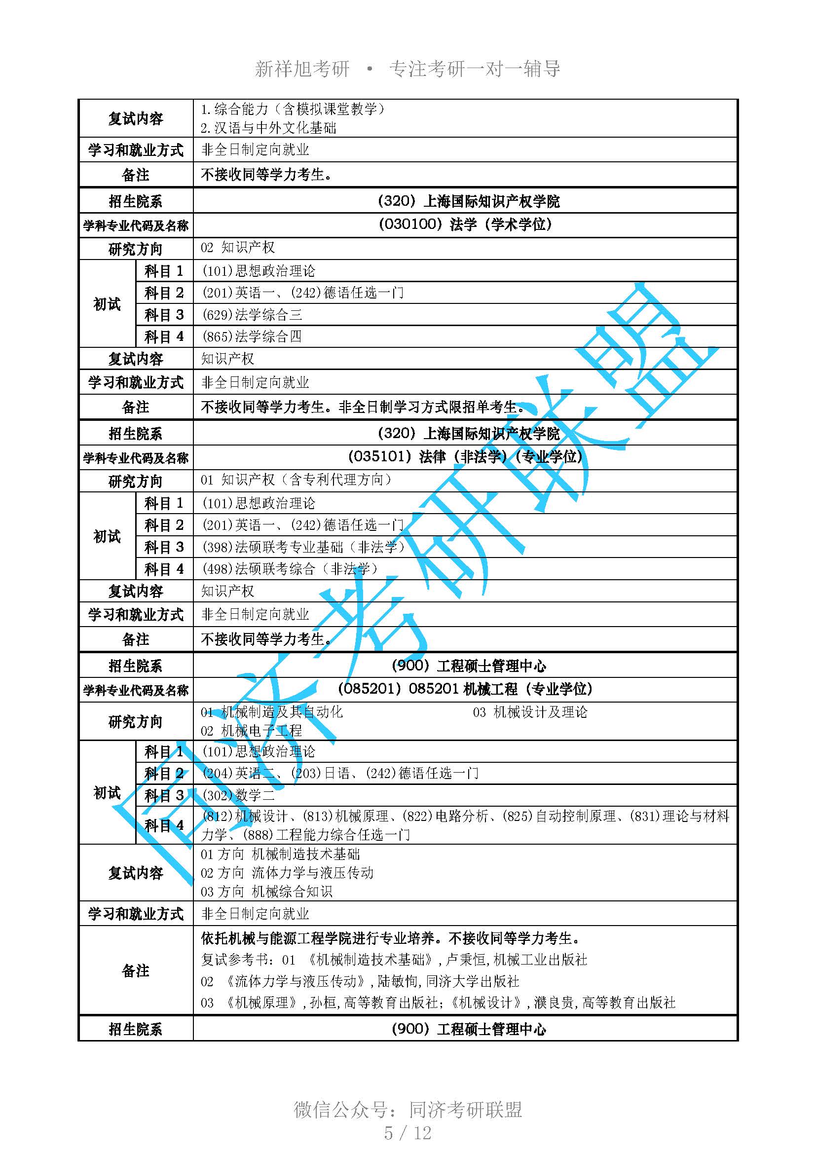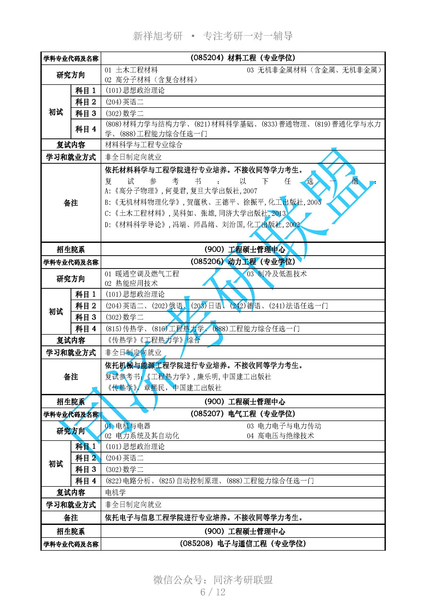 同济大学2019年专业硕士研究生招生专业目录、考试科目