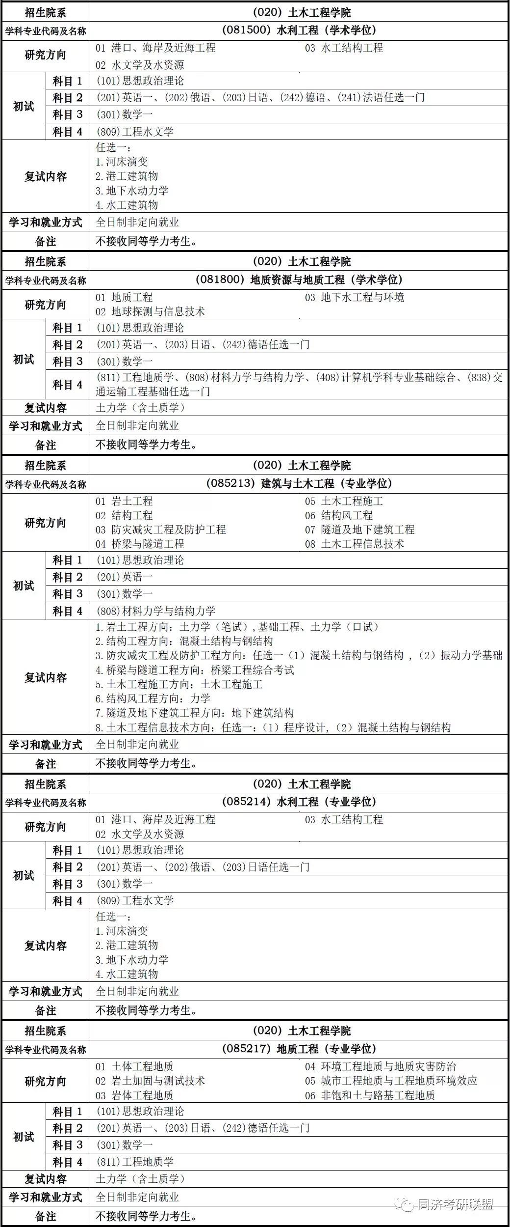 2019年同济大学土木工程学院考研招生专业、考试科目