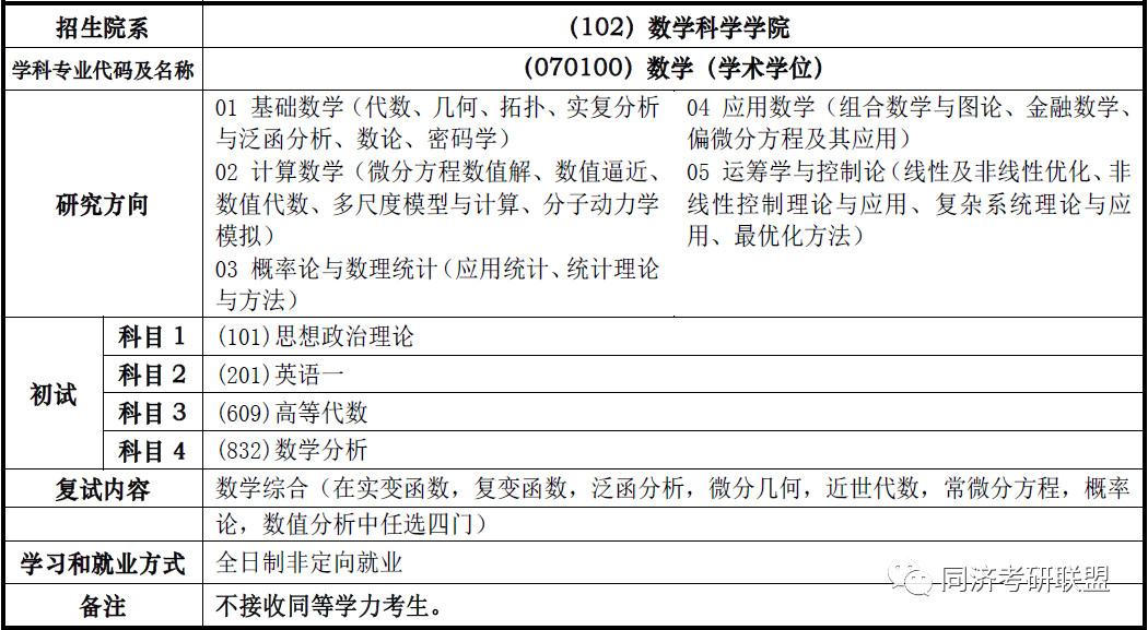 2019年同济大学数学科学学院考研招生专业、考试科目