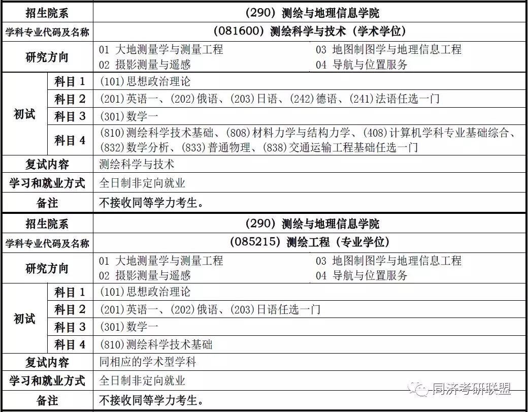 2019年同济大学测绘与地理信息学院考研招生专业、考试科目
