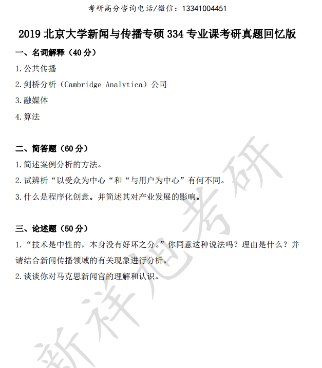 最新|2019北京大学新闻与传播专硕334专业课考研真题回忆版