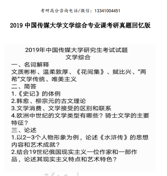 2019年中国传媒大学文学综合考研专业课真题回忆版