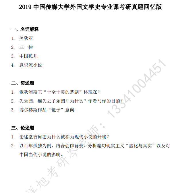 2019中国传媒大学外国文学史专业课考研真题回忆版